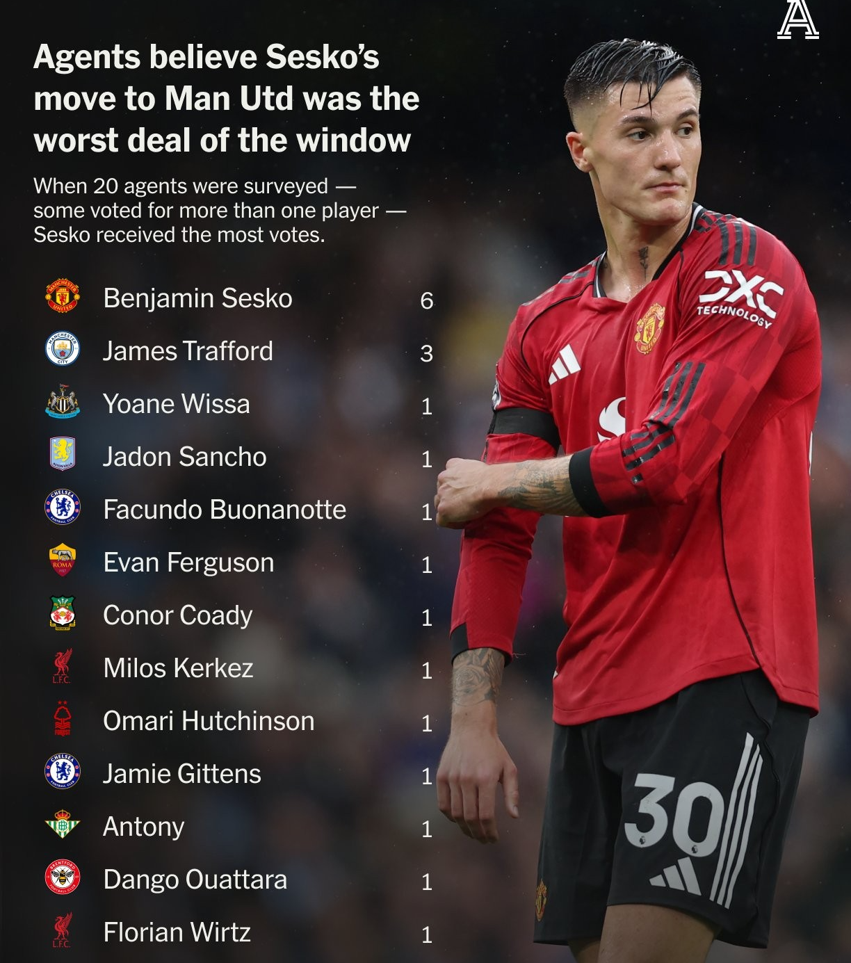 前不久,The Athletic通过20余位足坛经纪人的投票,发布了今夏最令人失望的引援排名。而在这其中,曼联花费7650万欧元从莱比锡引进的谢什科高居第一。