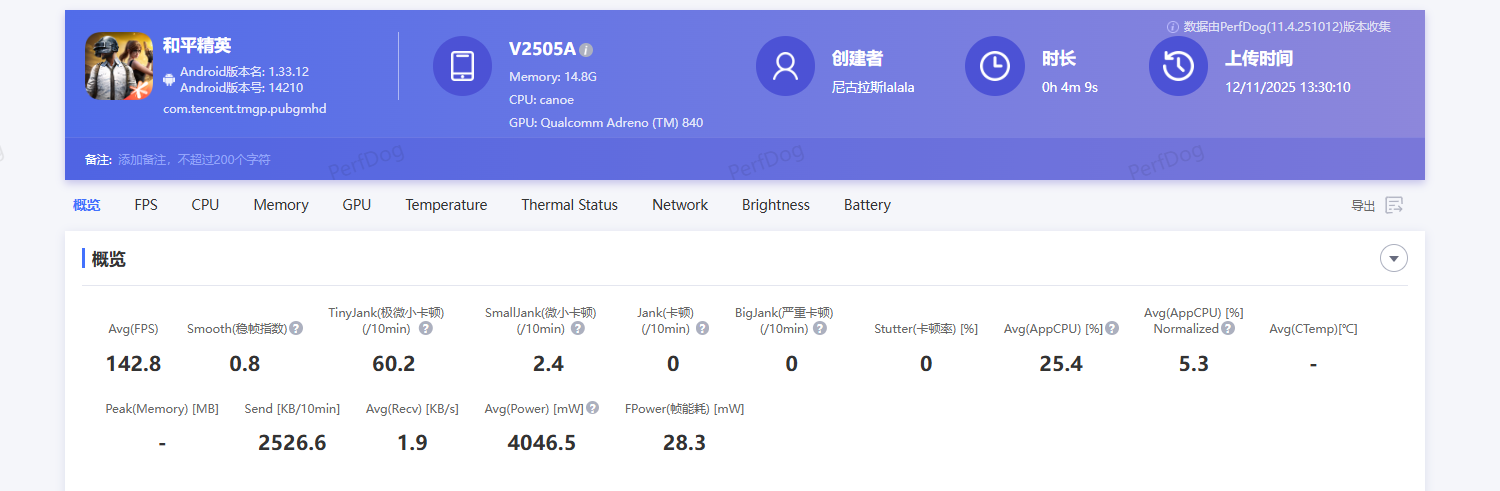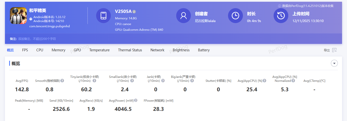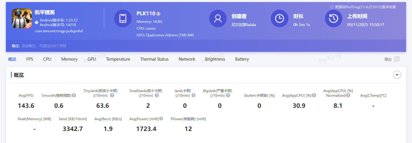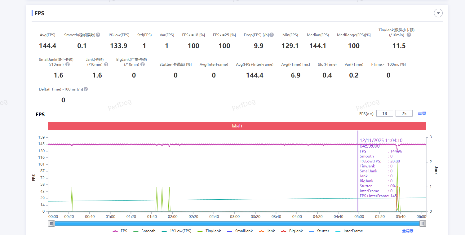 PerfDog的检测数据显示,iQOO 15的游戏平均帧率144.4 FPS,帧率方差(Var)低至1,几乎一条直线的帧率曲线,为职业赛场上的每一次操作都提供了坚实可靠的保障。