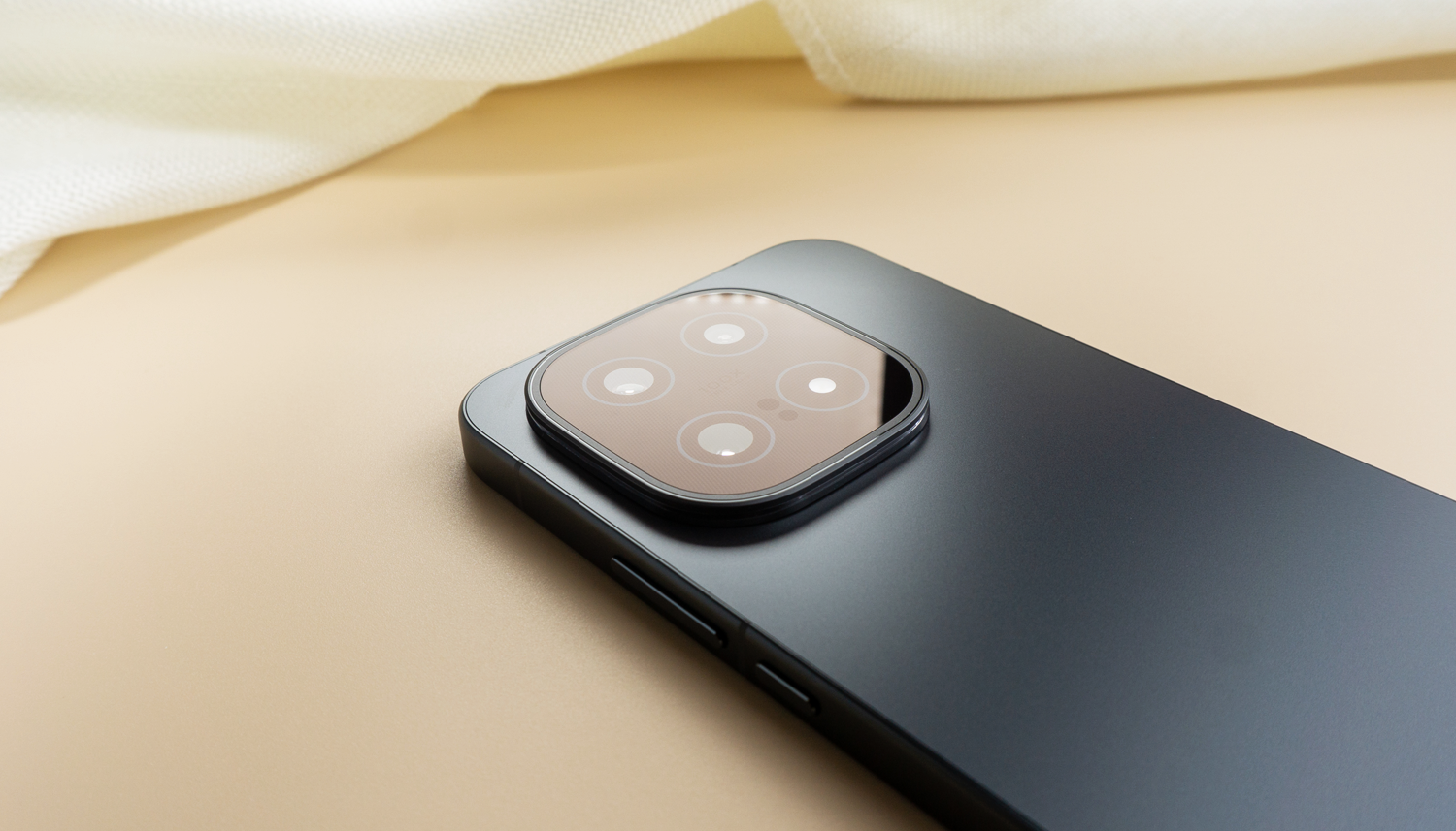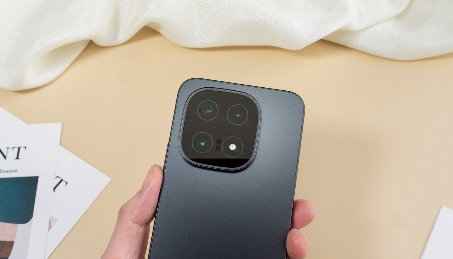 翻到背面,其后盖采用了AG磨砂工艺并辅以AF镀膜,触感细腻且不易沾指纹。摄像头模组采用悬浮Deco设计,并通过阶梯式结构化解了潜望式长焦镜头的凸起,整体看起来协调不少。