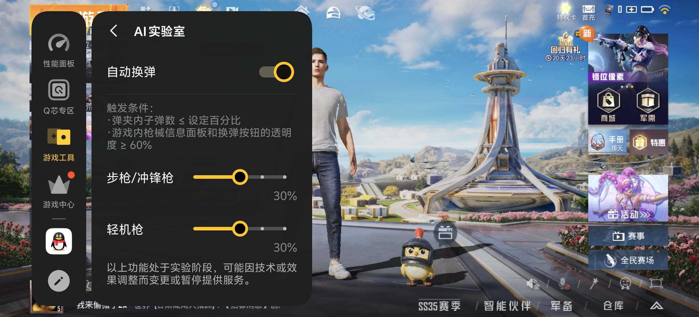 iQOO 15则是在《和平精英》中搞了个智能换弹功能,能根据弹夹内剩余的子弹百分比自动完成换弹操作。