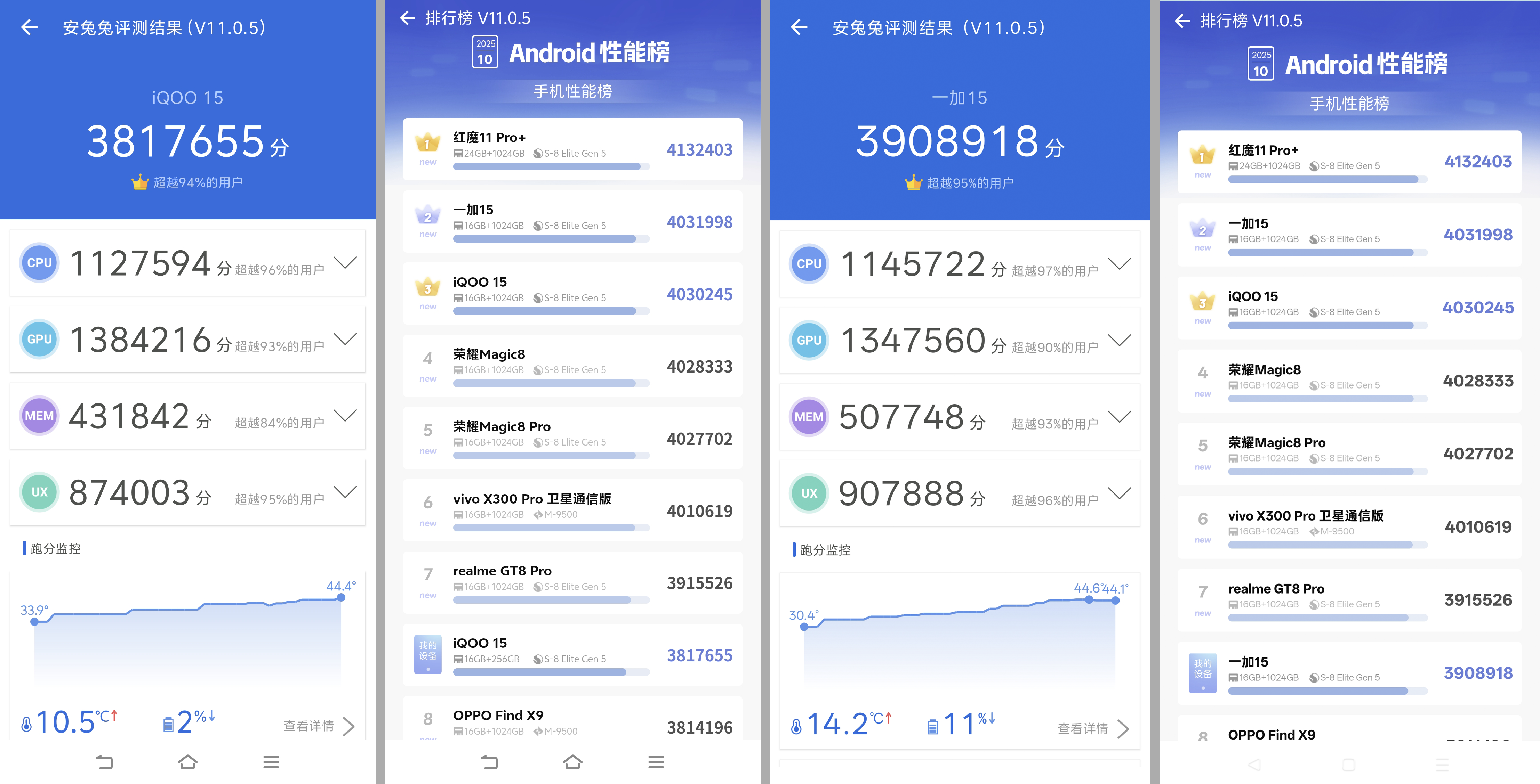 在性能测试软件安兔兔中,iQOO 15获得了3817655的总分,细分项表现为:CPU得分1127594,GPU得分1384216,MEM性能431842,UX分值874003,测试过程中设备表面最高温度44.4℃。而一加15则取得总分3908918的成绩,其在CPU(114572分)和UX(907888分)项目上表现较为突出,尤其是在MEM性能(507748分)上优势明显,不过GPU得分(1347560分)略低于对手。