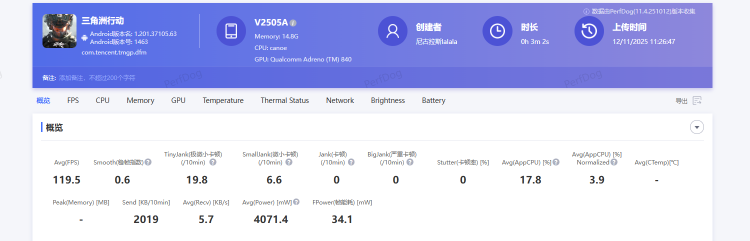 通过PerfDog性能狗的监测,一加15玩《三角洲行动》的平均帧率164.5帧,表现相当稳。需要特别指出的是,由于一加15采用双电芯设计,其Avg(Power)x2才是实际整机功耗,所以当前约为4.5W,能效控制出色。