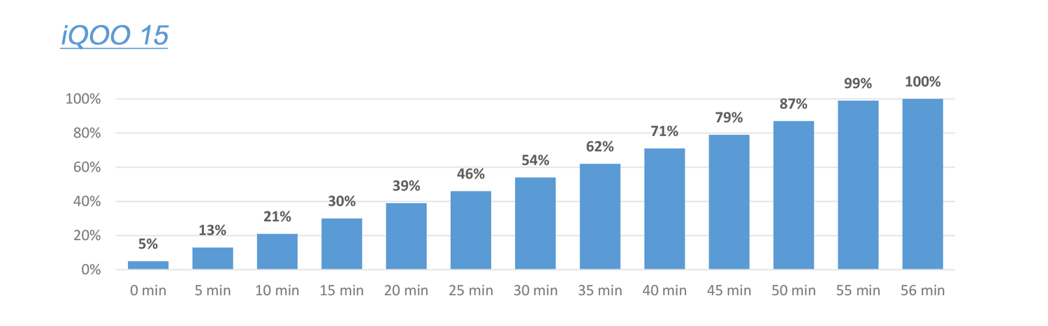 在充电效率上,iQOO 15的100W闪充使其从5%电量开始,10分钟后可恢复至21%;充电30分钟时达到54%;完整充满7000mAh电池需要56分钟,整体充电节奏相较一加15稍许迟了一些。