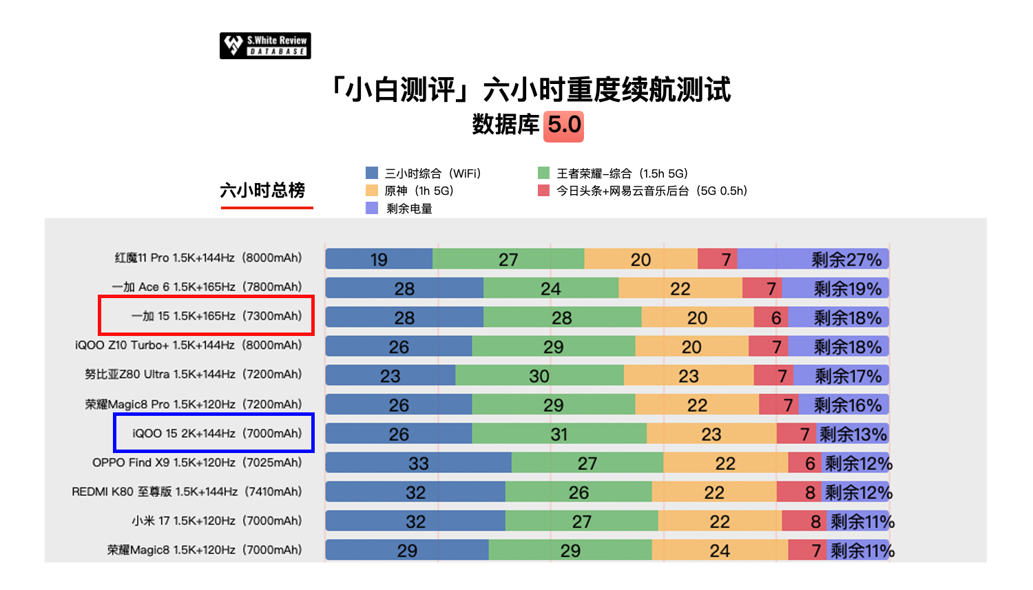 综合来看,一加15在续航时长、充电速度和电池健康保护方面更具优势;而iQOO 15则在保证基础体验的同时,强调了系统能耗与散热的平衡。
