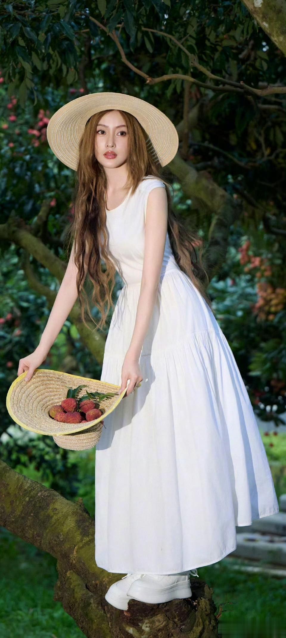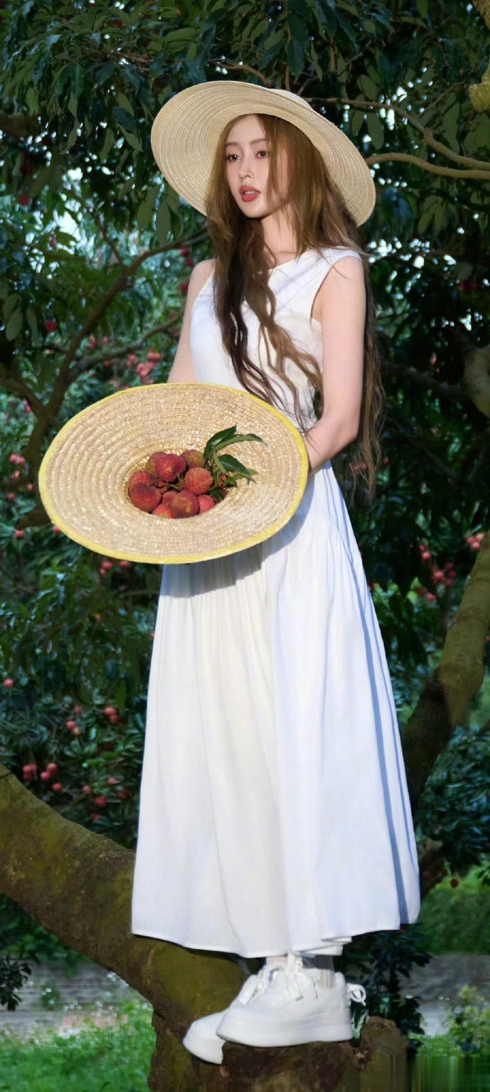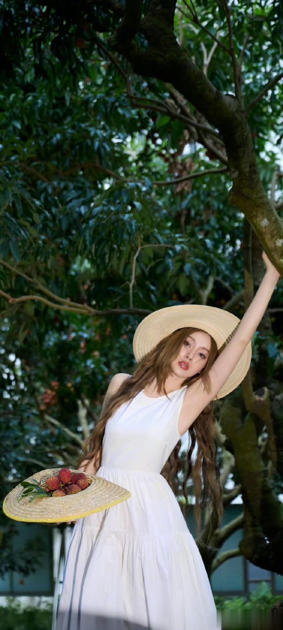 谁懂啊!张天爱这组「十七娘荔枝园采摘记」,直接美到可以当手机全屏壁纸✨一袭纯白无袖长裙,干净飘逸,草帽一戴,瞬间化身田园少女。绿叶掩映、红荔点缀,白裙在阳光下自带柔光。她抬手摘果、回眸浅笑,发丝随风轻扬,温婉又灵动,气质太绝。简单的白裙草帽,被她穿出了松弛高级感,清新又治愈,每一张都适合存来当壁纸。戏里是盛唐美人十七娘,戏外是荔枝园里的清新少女,两种美都好绝