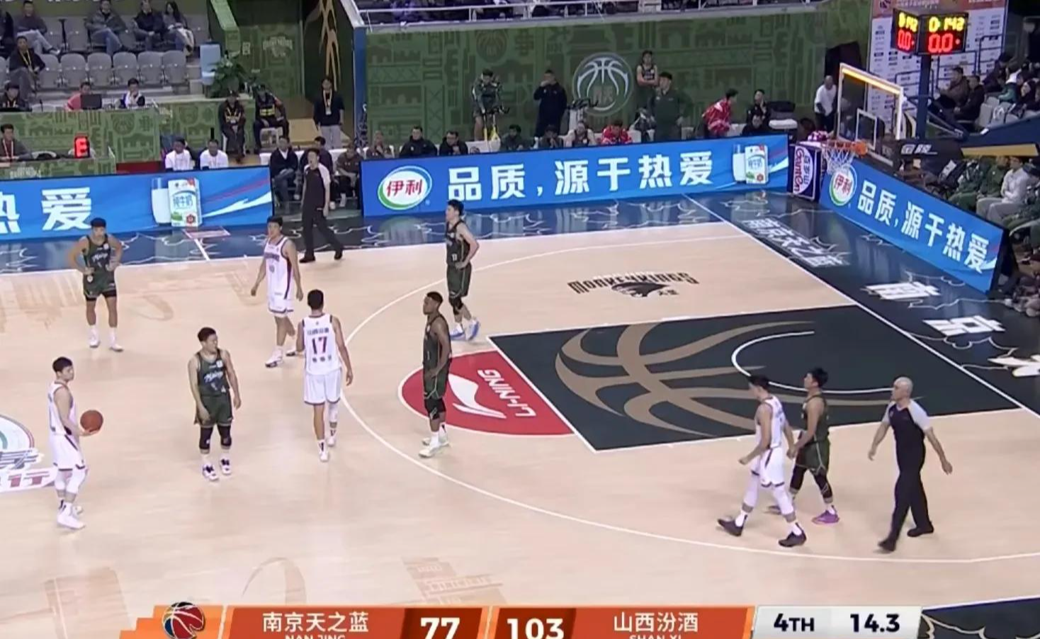 第四节。赛场狼烟燃,南京天不蓝。山西汾酒以摧枯拉朽之势,击碎了南京男篮成为强队梦想。看看南京第四节能不能反弹。郭昊文突破打进2分,葛昭宝翻身跳投2分,马鑫鑫突破造犯规两罚不中。裁判判罚山西提前进线,郭昊文遇到克星,迪亚洛盖帽。陈彭宇迪三分飙进,迪亚洛2+1。62比87。