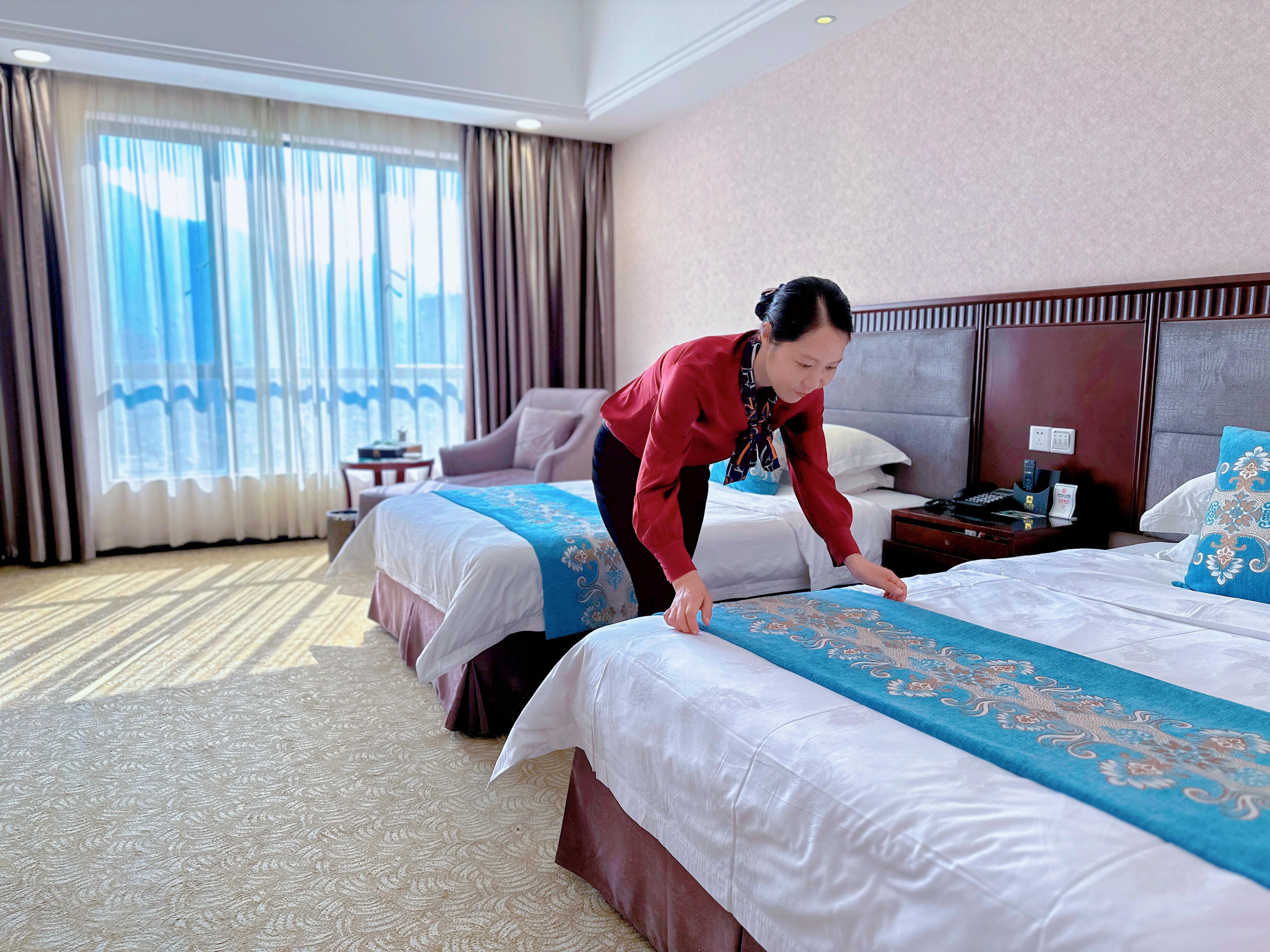 “您好,请问有什么可以为您服务?”一走进酒店,工作人员便热情地走上前询问,为赛事选手们提供全流程服务。从办理入住到酒店配套设施介绍、赛场指引、交通服务等,解答详细到位,尽显专业与温情。