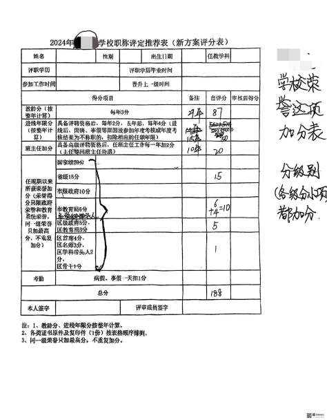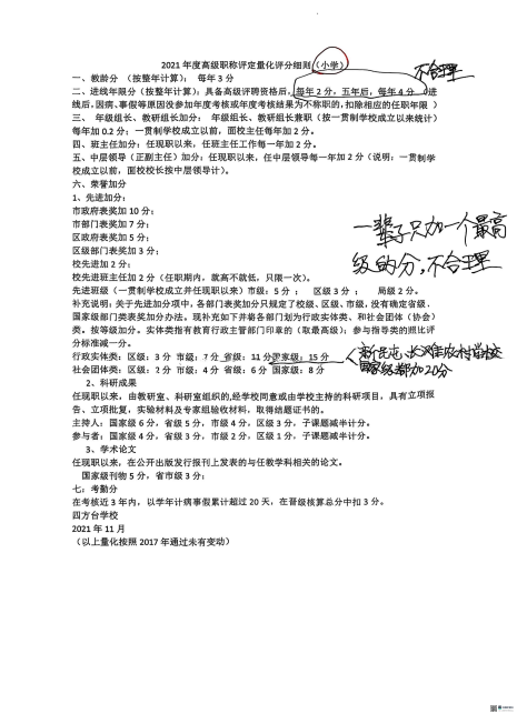 然而,这样的“实绩答卷”,在铁西区四某台学校的评审细则面前却“大打折扣”。该细则明确规定,无论教师获得多少项荣誉,仅取其中一项最高荣誉计分,其余全部作废;且国家级荣誉的加分仅为15分,远低于周边同类农村学校20分的普遍标准。