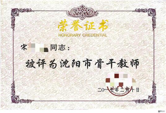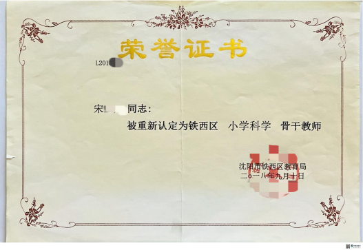 宋英(化名)是辽宁省沈阳市铁西区四某台学校的教师,扎根教育一线工作26年,在职期间荣获多项荣誉,包括部级优秀课、国家级优质课教学设计一等奖、省级优秀课一等奖等教学类荣誉,以及沈阳市骨干教师、沈阳市筑基带头人、沈阳云课特殊贡献奖、沈阳市说课大赛一等奖等个人能力与贡献类认证,是该校近年来获得荣誉级别最高、覆盖范围最广的教师。