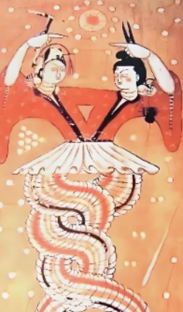 你看这幅在新疆出土的,著名的《伏羲女娲图》,上面是怎么画的?
