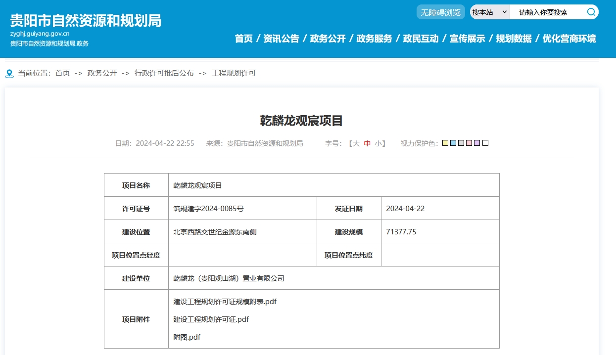 4月22日,贵阳市自然资源和规划局发布乾麟龙观宸项目获得建设工程规划许可证公告。该项目即将启动开工建设,建设单位为乾麟龙(贵阳观山湖)置业有限公司。