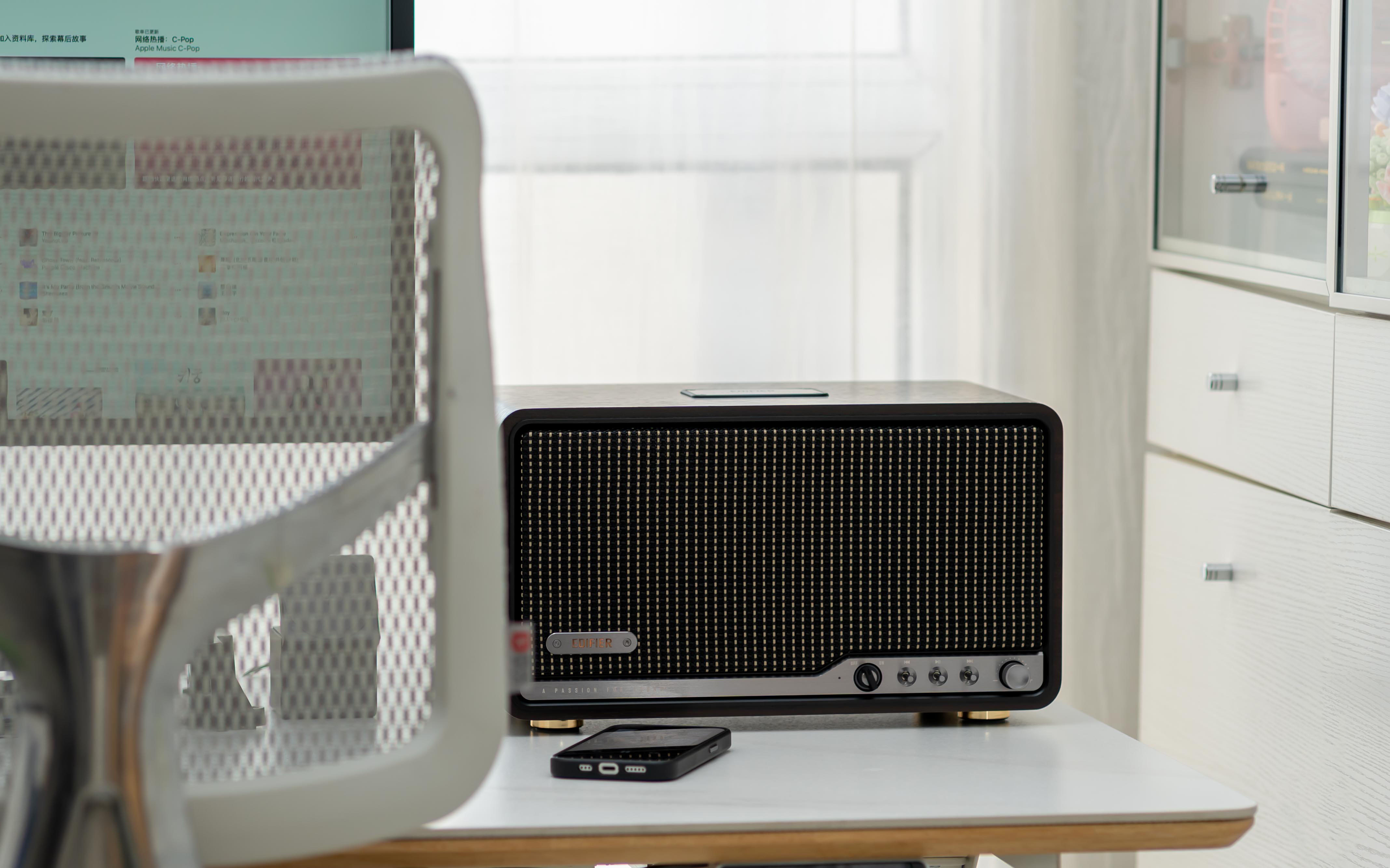 机身采用15mm厚的全木质箱体,有效抑制谐振。正面的金属网罩保留了做旧磨砂感,为音箱增添了复古韵味,在精致中彰显独特个性。