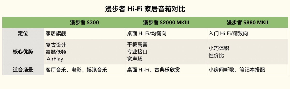 简单总结,追求家居美学、震撼低频选S300,追求均衡全能选 S2000MKIII,追求小巧,Hi-Fi入门S880 MKII。