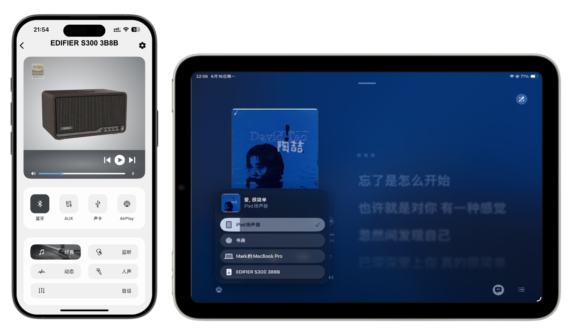 ③ 对Apple生态实现了无缝适配,支持AirPlay隔空播放,这对于苹果用户来说是极大的福音。我作为MacBook Pro的深度用户,只需轻点屏幕,电脑里珍藏的Hi-Res无损专辑便能通过S300音箱播放。