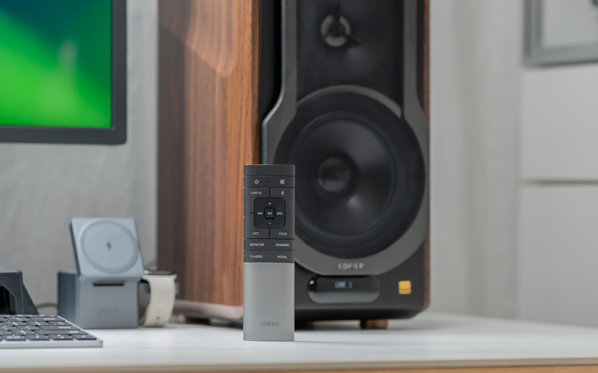 ③ 与前面两款音箱不同的是,漫步者S880 MKII采用全新2.4G触控式遥控器,操作方便,小巧精致,而且和桌面很搭配。