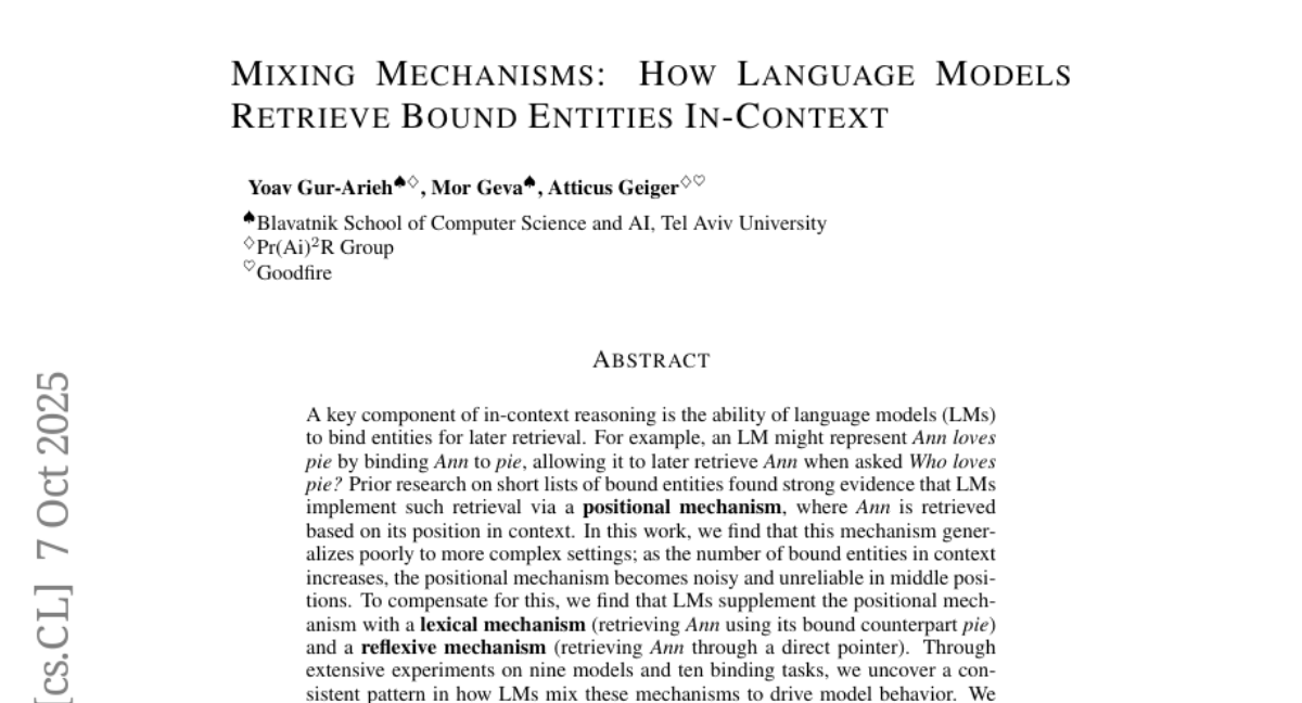 长期以来,研究界普遍认为语言模型主要依赖一种"位置机制"来处理实体绑定——简单来说,就是通过记住信息在文本中的位置来找到答案。就像你记住某本书的第三章讲了什么内容一样,模型会记住第二个句子讲的是安妮和苹果派的关系。
