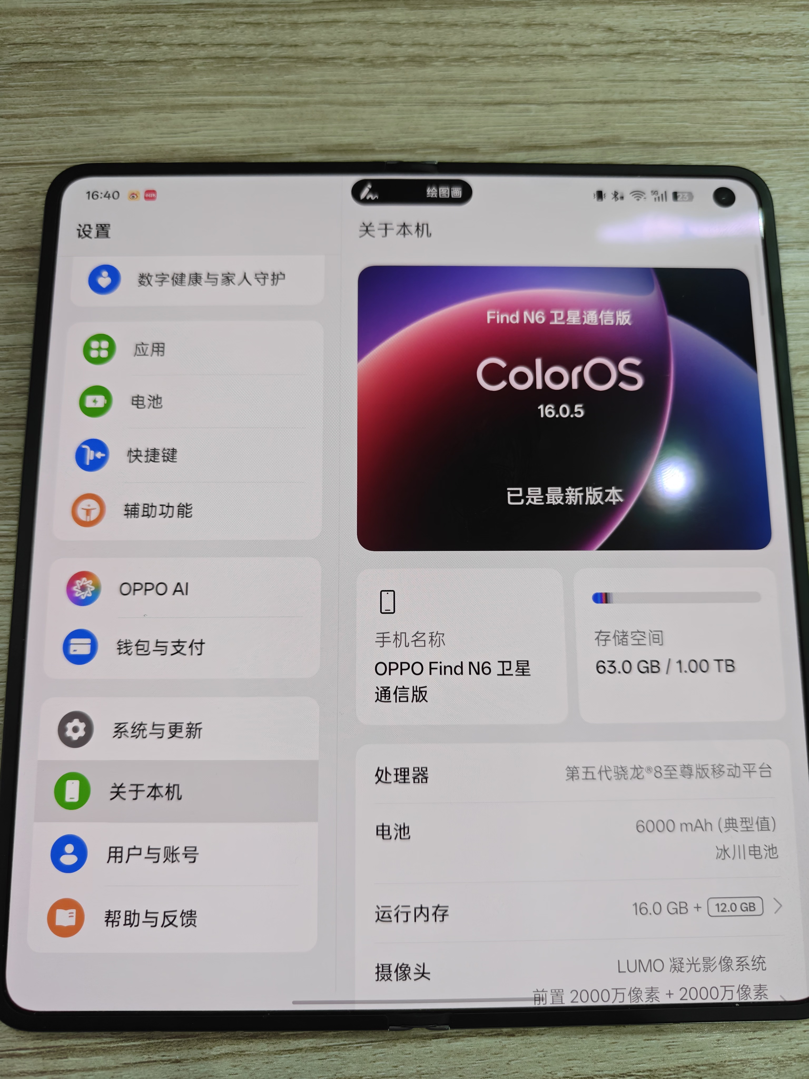 而且 225g、8.93mm的机身厚重也是非常的舒服,可能对于用惯直板机的各位没啥感知,但是对于我用惯了239g、12.1mm的三星Fold6来说,我是真觉得轻松太多了,真的舒服不开玩笑。拿在手里真的更像一台正常手机,不像以前那种一上手就提醒你“我是一台折叠屏”。续航这块也让我挺惊喜,Find N6 是 6000mAh 电池,日常用下来明显更安心了,不用出门先想着省电,也不用动不动找充电器,这种纯纯放心用的感觉还是挺OK的。