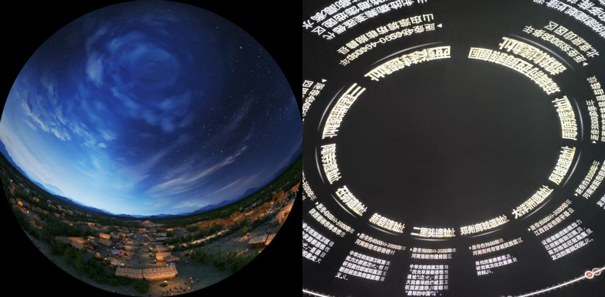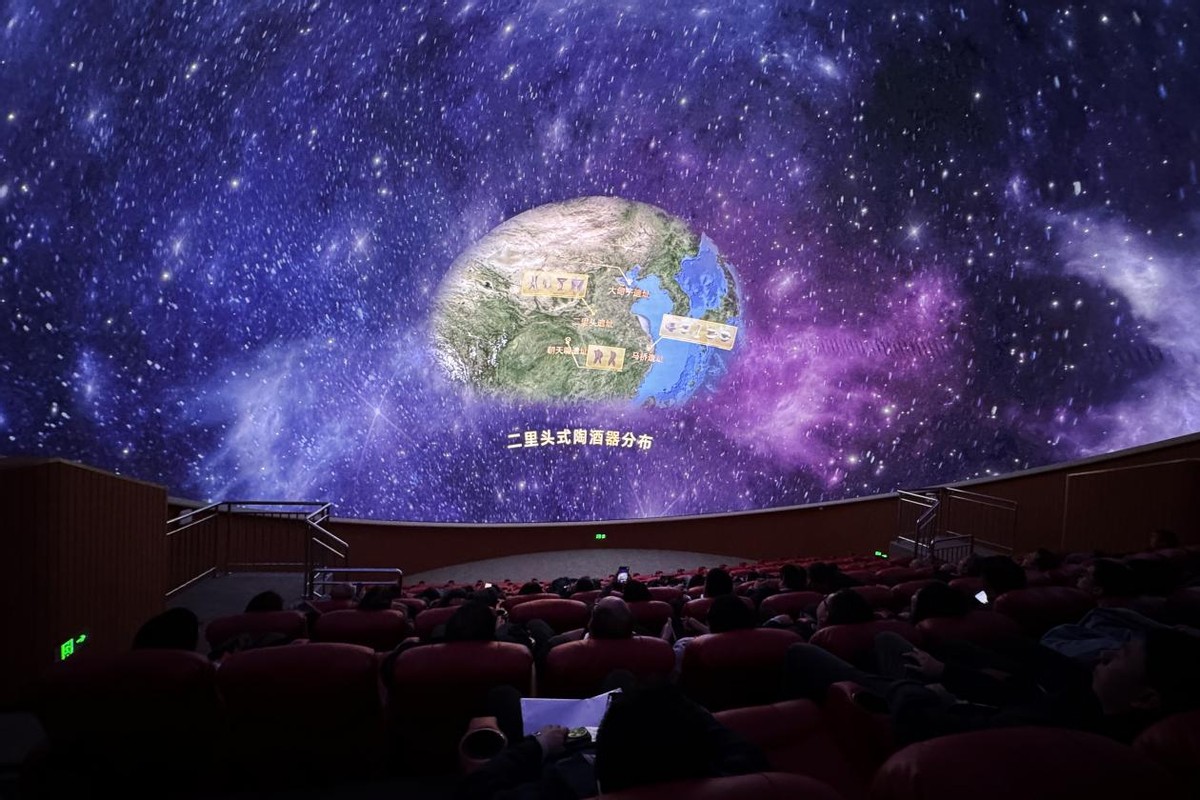 影片带领观众俯瞰这座3800年前的庞大都邑,纵横交错的"井"字形大道勾勒出中国最早的城市中轴线蓝图。一号宫殿宏大的夯土台基、二号宫殿神秘的祭祀场所,在球幕空间中得到全景式呈现。