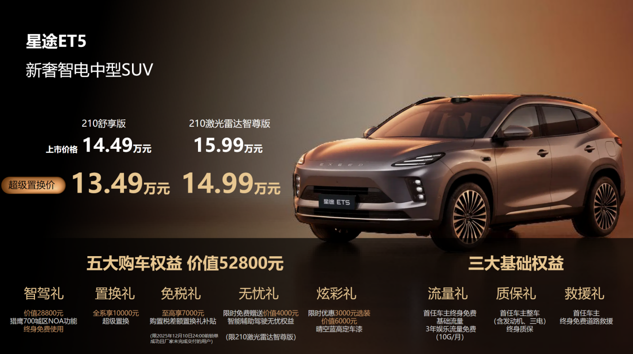 在万众期待的价格揭晓环节,星图ET5正式公布两款配置车型的官方指导价与专属权益:210舒享版、210激光雷达智尊版官方指导价14.49万元-15.99万元,超级置换价低至13.49万元-14.99万元,以满满诚意回馈东北地区消费者。更重磅的是,品牌宣布猎鹰700城区NOA功能终身免费使用,同时退出价值52800元的五大限时购车权益,不分权益限时尊享。
