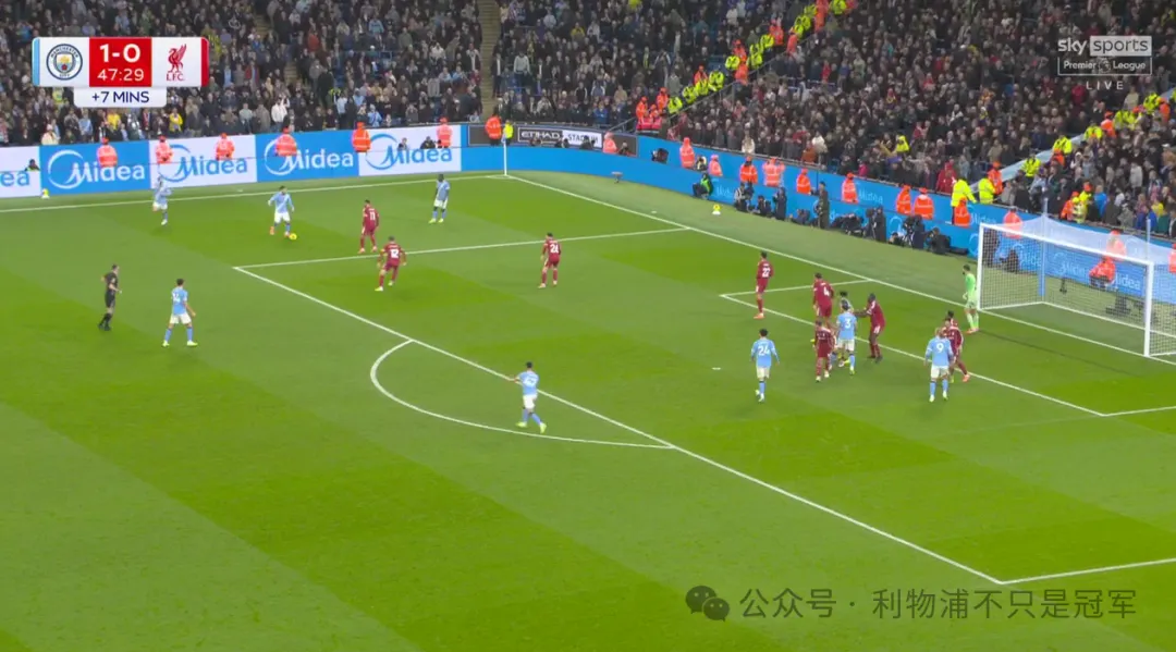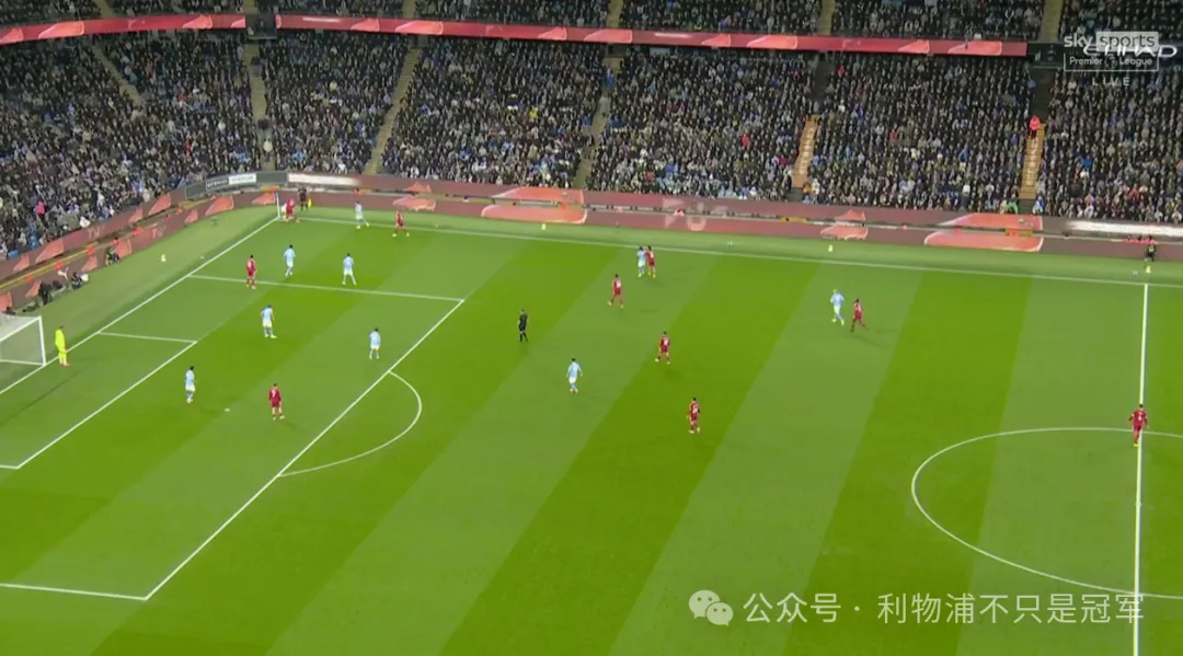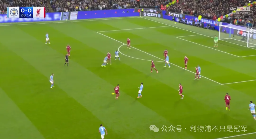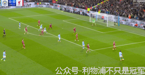 曼城27分50秒左右反击到利物浦左路,由于盯防切尔基的罗伯逊被拉到中路,而曼城攻击到利物浦左路时,左中卫范迪克被迫补防到左后卫位置,这是曼城本场针对利物浦的战术之一,就是要让范迪克离开利物浦中路!