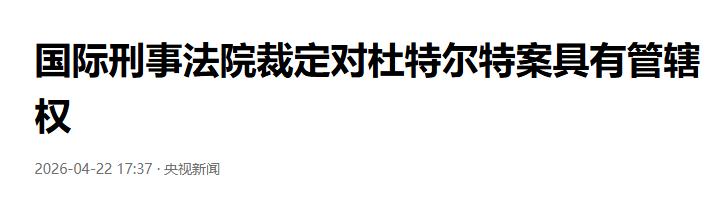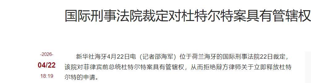 一、4月22日大反转:ICC定调,莎拉突然获准出国这两件事看似无关,实则暗藏关联,捋清时间线就不难发现其中门道,当地时间2026年4月22日,荷兰海牙国际刑事法院上诉庭,首席法官卡兰萨宣读判决书,明确该院对杜特尔特案有管辖权,同时拒绝了辩方立即释放老杜的申请。