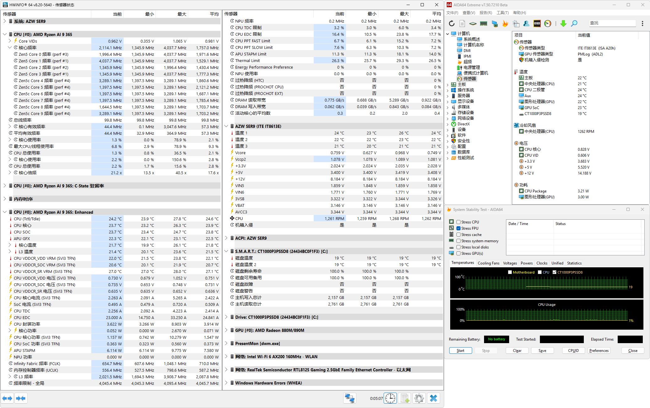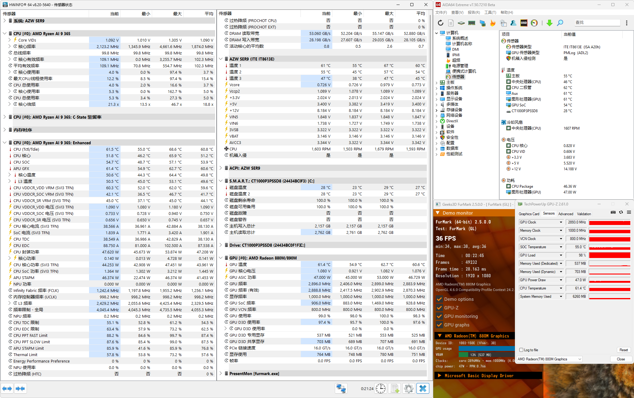 前台开启AIDA64、GPU-Z与HWiNFO的传感器功能,后台仅Win11默认进程,FurMark开启RUN,运行iGPU单烤超过21分钟,观察传感器当前值。