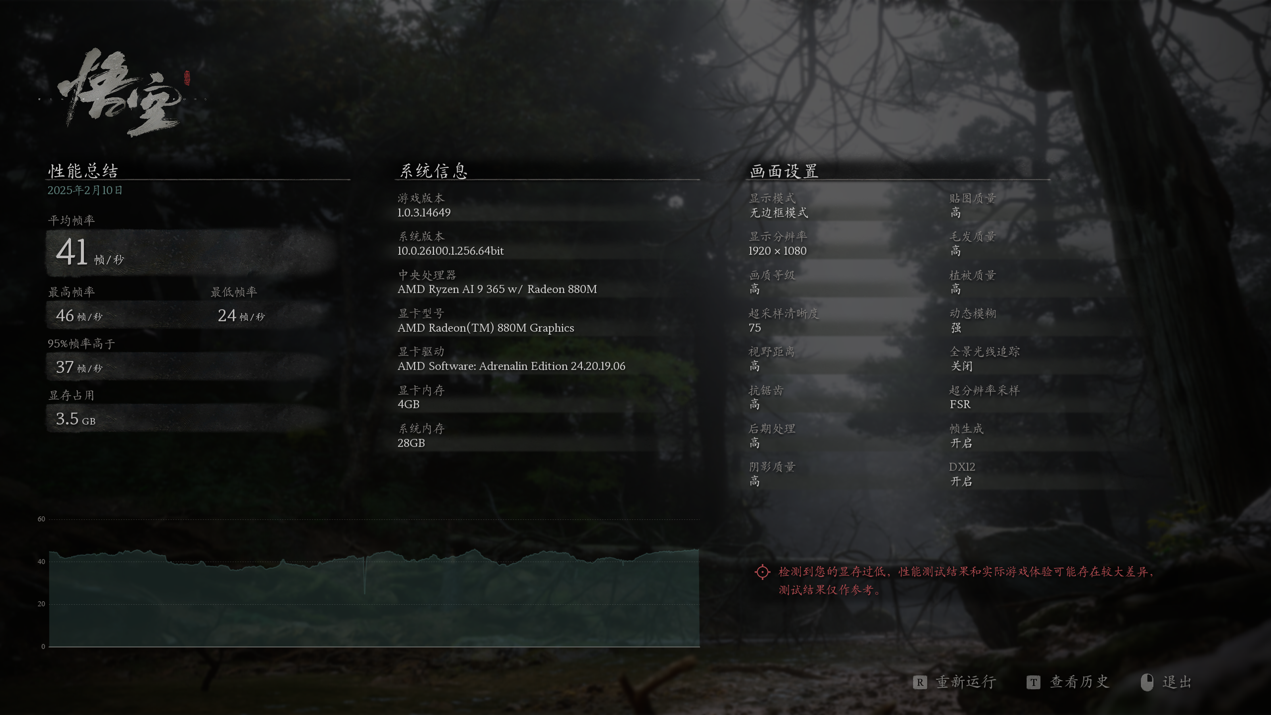 1080p分辨率/FSR清晰度75/帧生成开启/光追关闭/画质等级高,平均帧率41fps,95%帧率>37fps,高画质帧率下降10fps左右,追求流畅度的可适当降低FSR清晰度。