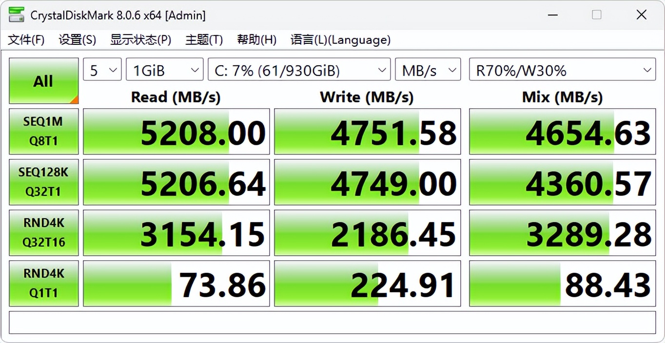 CrystalDiskMark跑分,顺序读写速度为5208MB/s与4752MB/s,4K随机(Q1T1)读写速度为74MB/s与225MB/s,符合中端PCIe 4.0硬盘的性能表现,顺序写入性能明显优于QLC旧版。