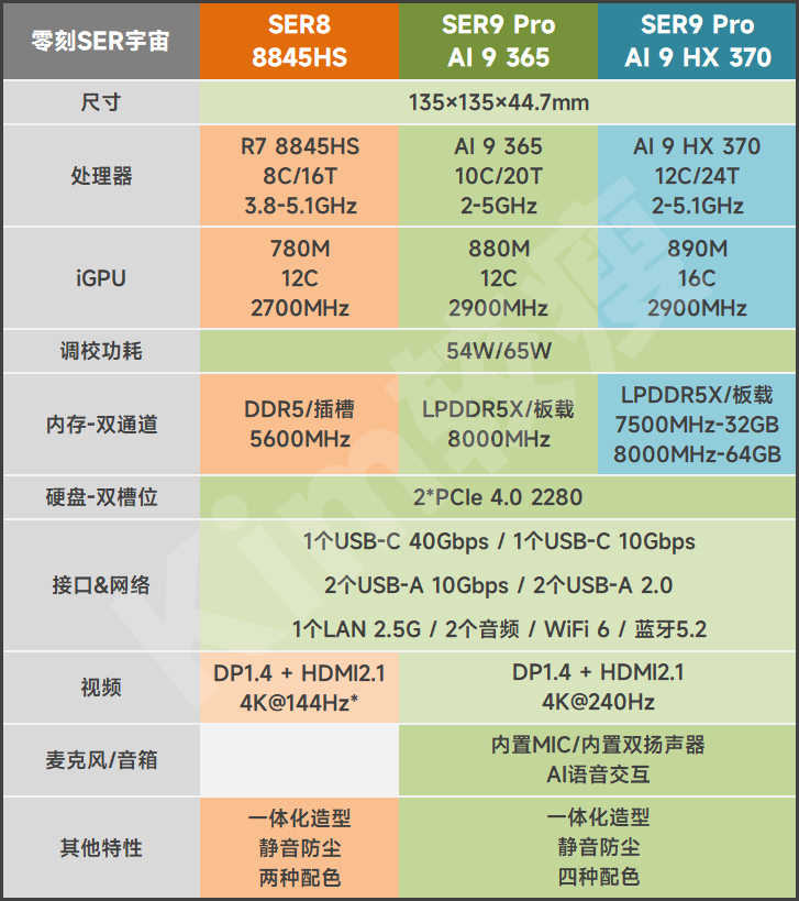 事实上,零刻SER9 Pro有两款机型,模具完全一样,区别仅在于处理器,有点类似笔记本电脑的细分策略。高配版采用AI 9 HX 370,妥妥AI世代的移动处理器之光,从CPU-iGPU-NPU全面进化,唯一遗憾是定位偏高。所幸的是零刻从善如流,于2025年春节档又推出采用AI 9 365处理器的SER9 Pro标准版,比高配版便宜600大元,相当亲切。