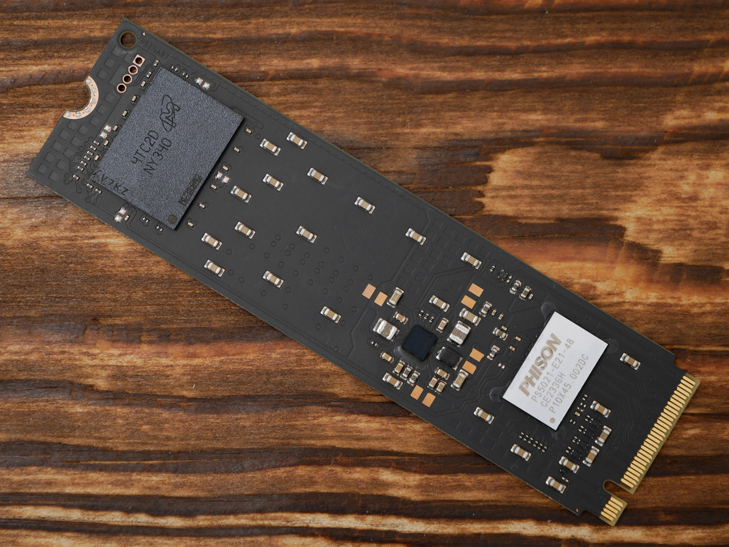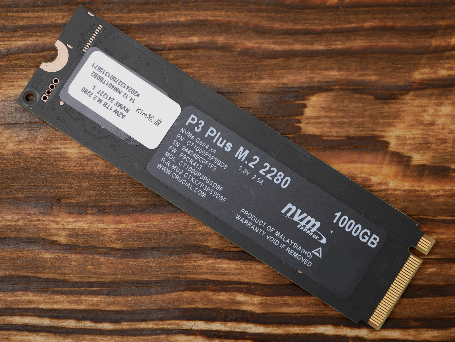 SER9 Pro标配1TB固态硬盘,拆解样品采用英睿达P3 Plus固态硬盘,PCIe 4.0协议,无缓存设计,等等,这块硬盘怎么……既熟悉又陌生!老玩家都懂的,英睿达P3 Plus也算零刻御用物料,但以往的配方都是176层QLC闪存×墨西哥组装,这回整个PCB连同闪存都大变样,不禁令人好奇。