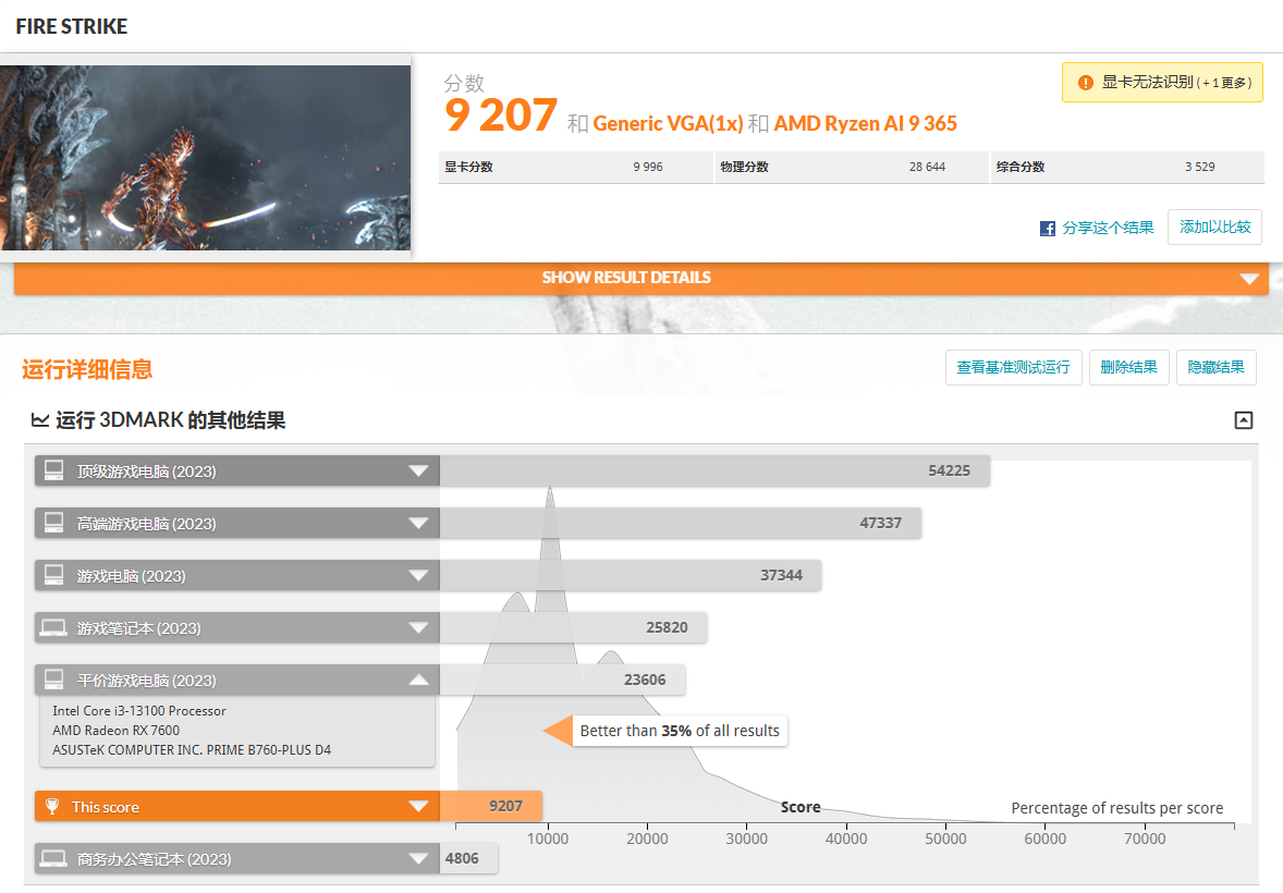 3DMark-Fire Strike跑分天梯分布图同样印证上述结论,零刻SER9 Pro的总分超越35%的样本,介乎“平价游戏电脑”与“商务办公笔记本”之间。