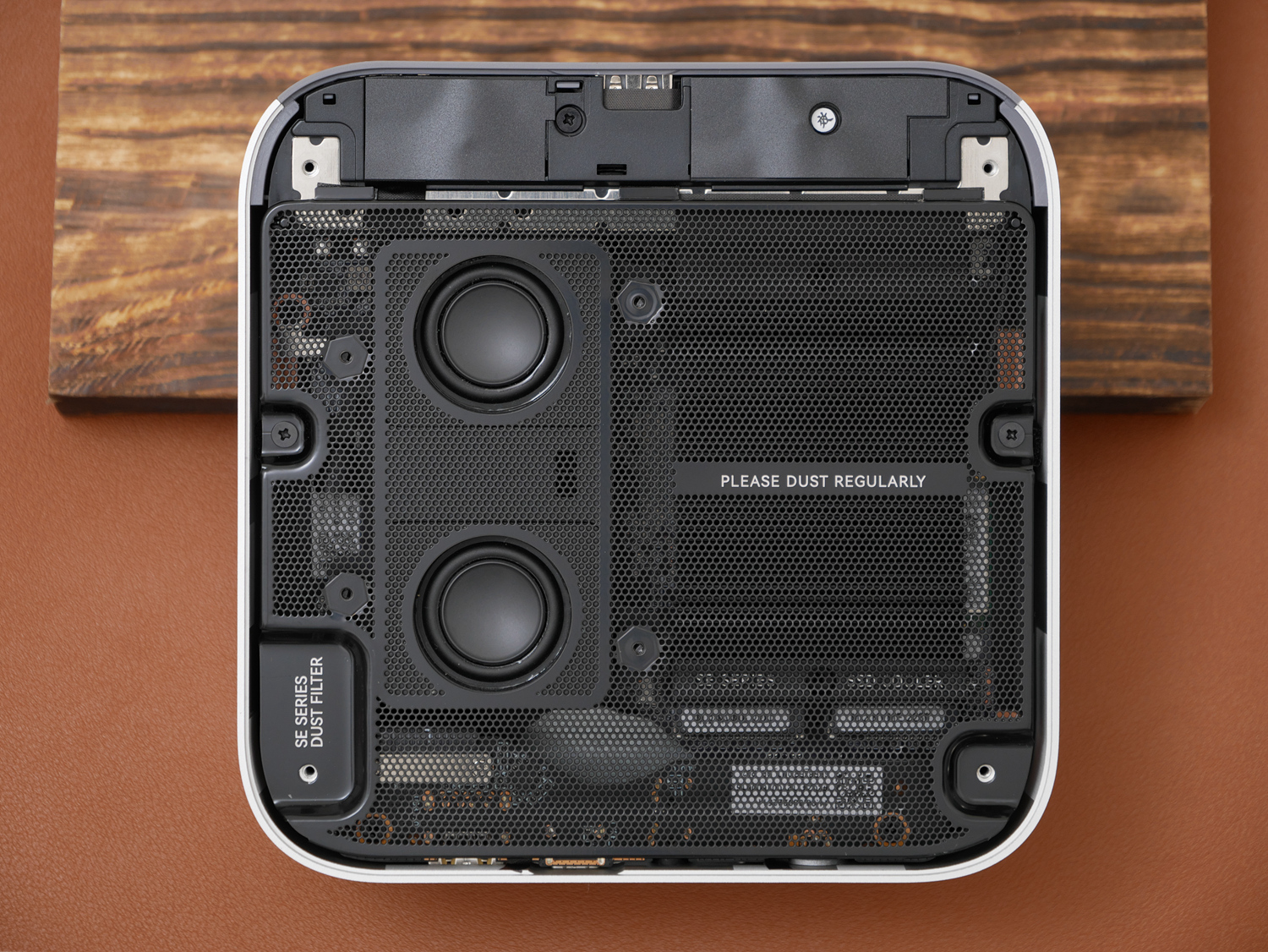 取下塑胶底板后,可见金属防尘网,以及防尘网上的两个显眼包(内置扬声器),拆解防尘网需拧下左右两颗螺丝。需要注意的是,防尘网兼做内置音响的固定支架,音响与主板有排线相连,拆解防尘网时要温柔一些。