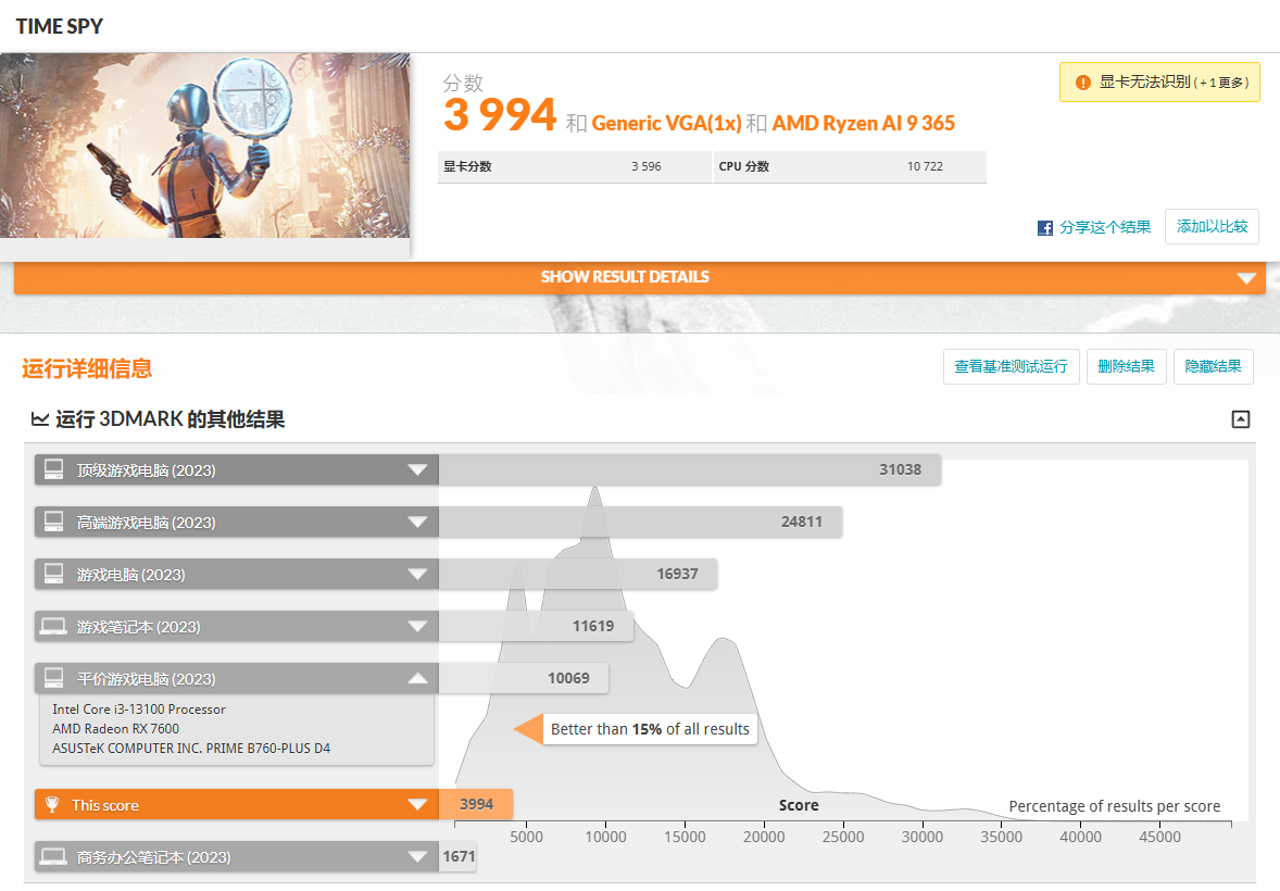 在3DMark-Time Spy跑分天梯分布图里,零刻SER9 Pro的总分超越15%的样本,相比“商务办公笔记本”依然优势明显,妥妥核显之光。