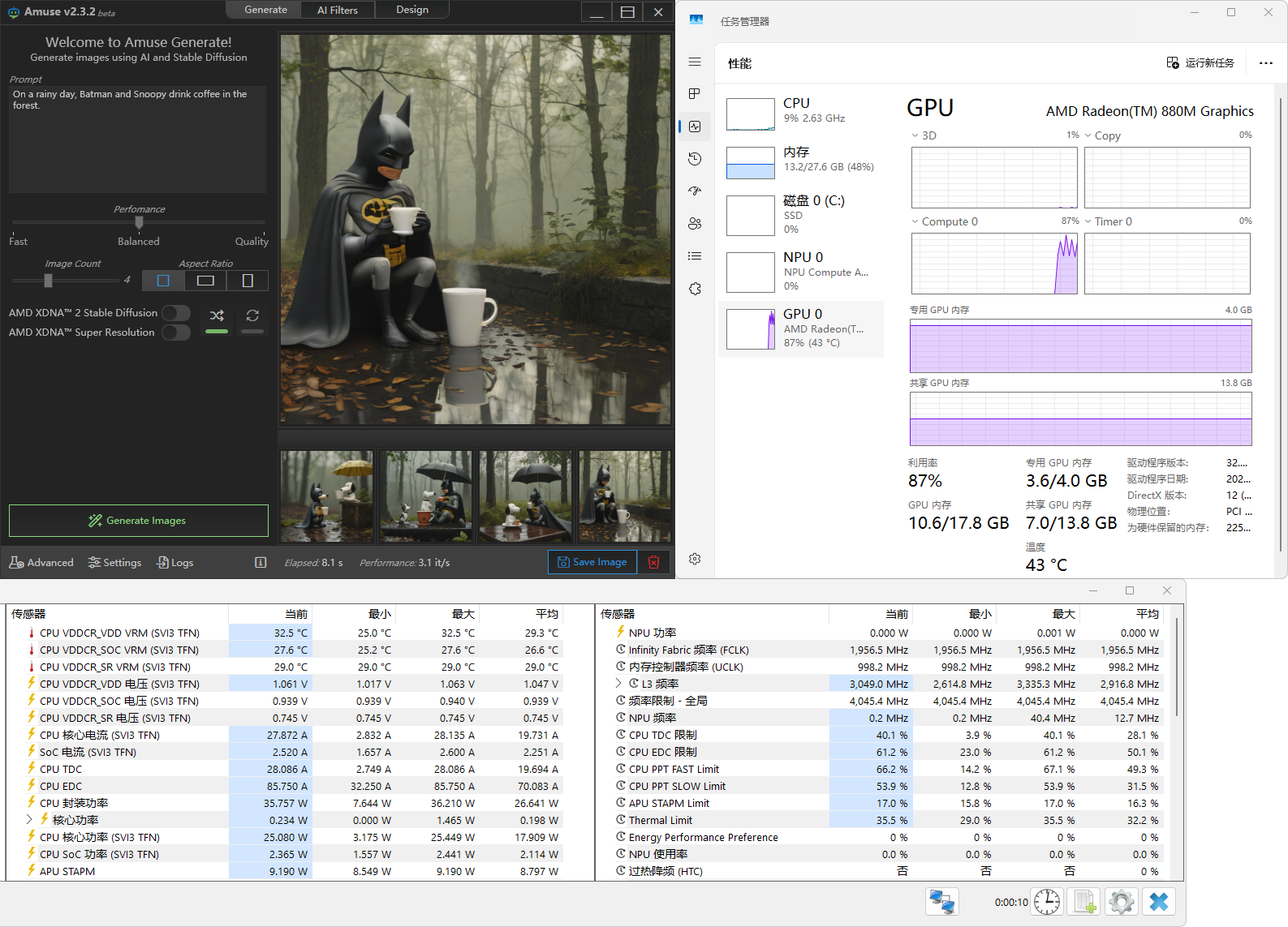 关闭两个XDNA选项,纯粹由iGPU提供AI算力,此时iGPU负荷最高,CPU轻度参与,NPU在家睡觉。生成四张图片总耗时8.1秒,迭代速度为3.1it/s,注意看CPU封装功率(平均值)为26.6W,mark一下,稍后对比。