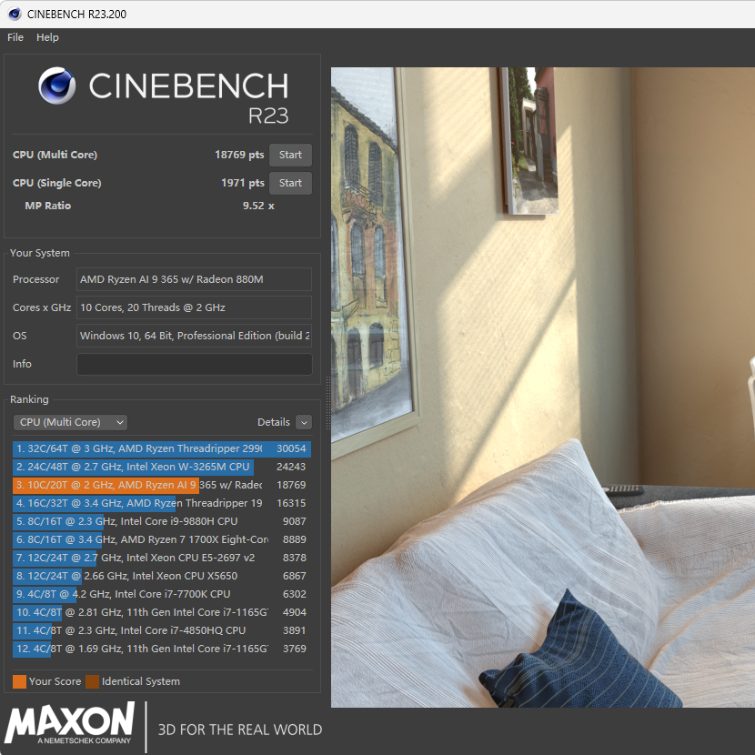基于影视行业Cinema 4D特效引擎的权威CPU基准测试软件,单核成绩1971,相比锐龙8845HS提升13%;多核成绩18769,相比锐龙8845HS提升20%。