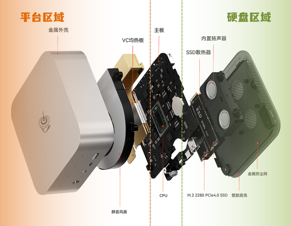 忍不住夸一句,零刻的主板设计与内部堆叠相当紧凑,各种零件&接口布局合理,散热与风道也考虑周到,不愧是迷你电脑老法师。