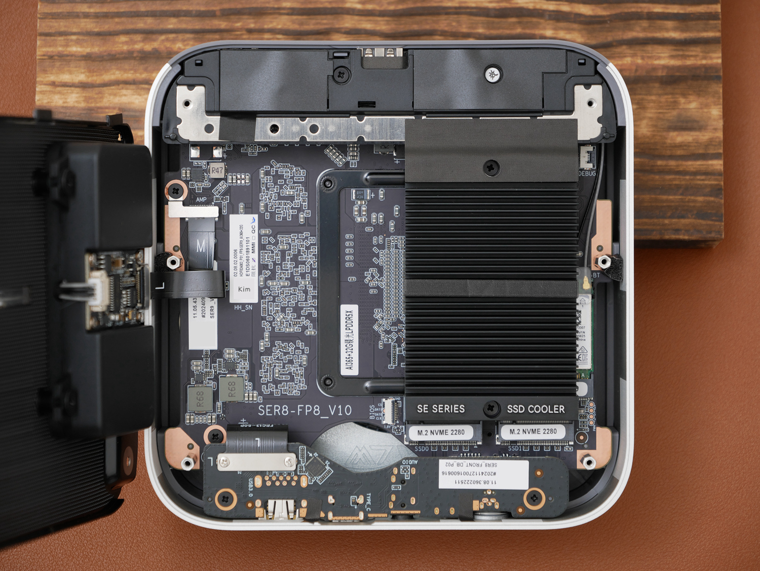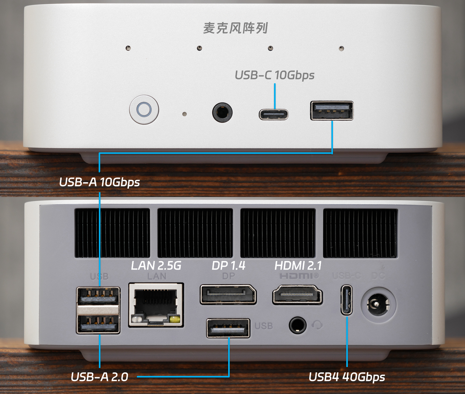 相比SER8最大的改进,就是面板上的四个小孔(哦不,四个麦克风),搭配内置双扬声器,可轻松支持主流AI大模型的语音交互,大大提高生产力与娱乐力。