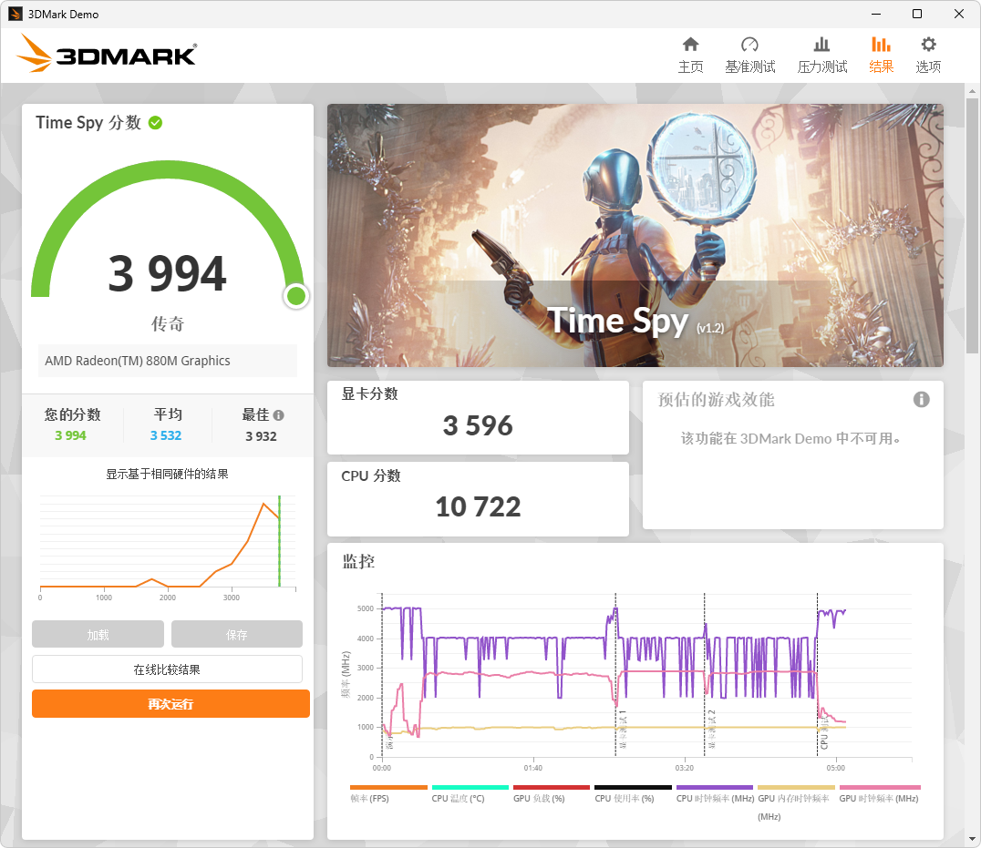 渲染分辨率2K的DirectX 12基准测试,总分3994,显卡项目3596,CPU项目10722。显卡项目相比锐龙8845HS提升23%。