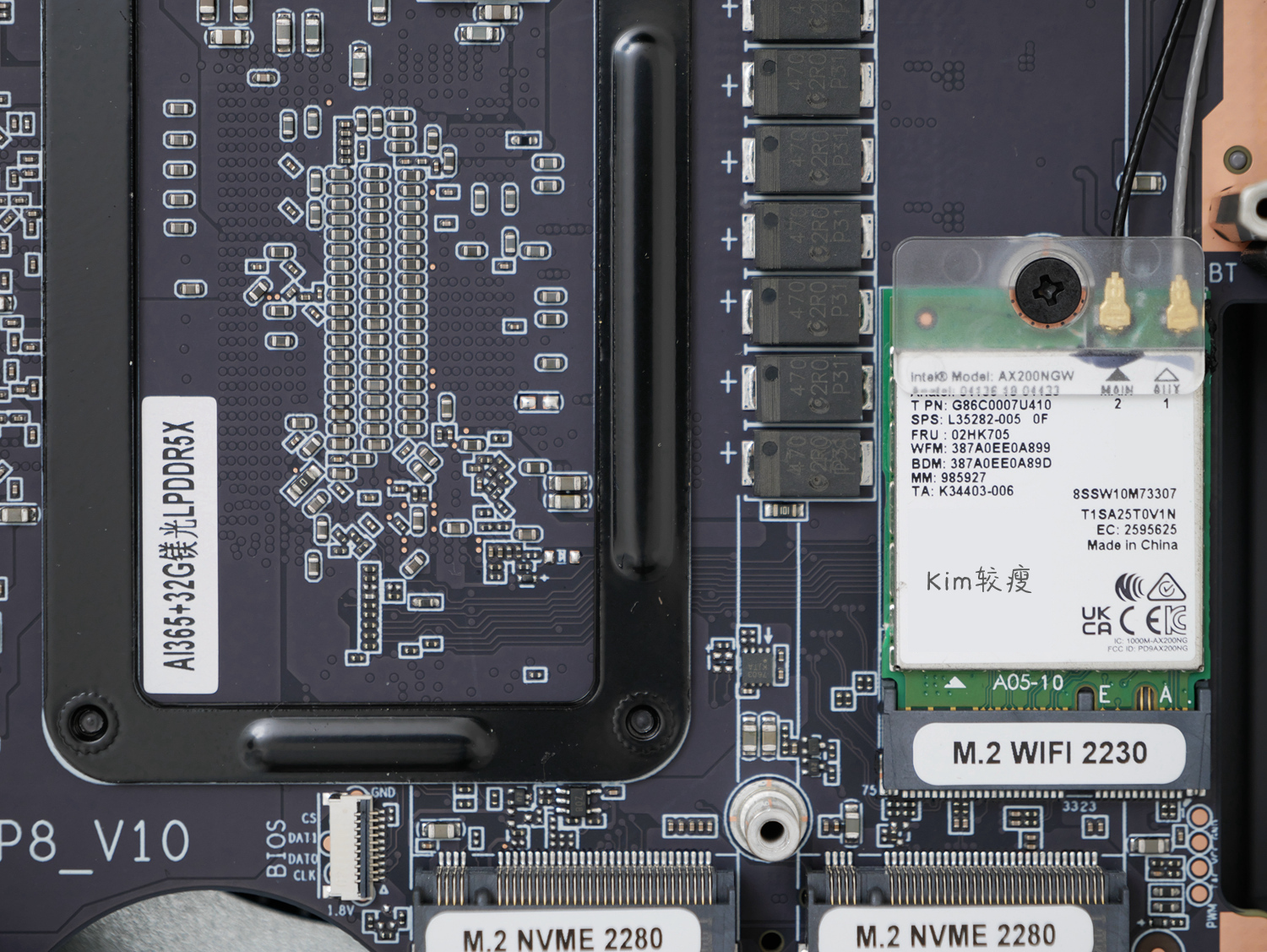 取下SSD散热器,就能更换M.2硬盘与无线网卡,由于SER9 Pro采用板载内存,那么2个硬盘插槽与1个网卡插槽就是整机的DIY空间。硕大的SSD散热器,确实令人安心,需要提醒的是,为避免局部发热,安装单硬盘时建议避开无线网卡堆叠那个插槽。