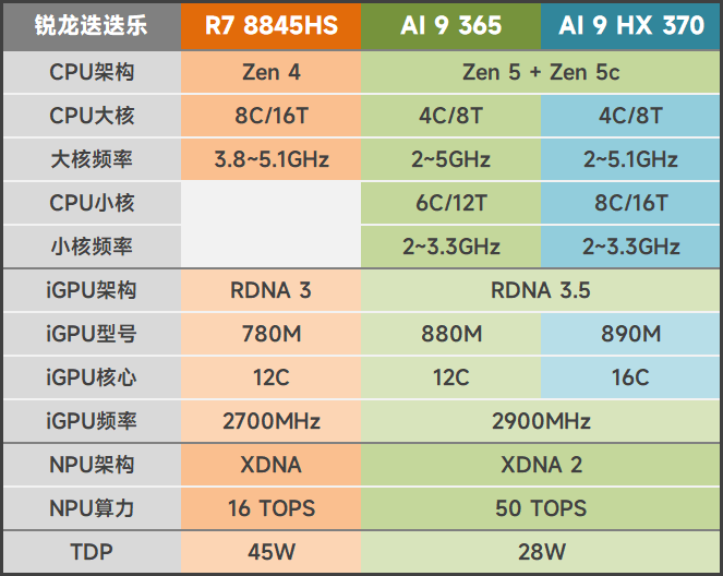 处理器迭代方面,相比上代锐龙8000系列,船新的锐龙AI 300系列可谓架构大更新,首先CPU部分升级为Zen5大小核架构(核心变多,能效提升),其次iGPU部分迭代至RDNA3.5架构(365维持12核,370升级16核),最后也是最重要的,NPU部分迭代至XDNA2架构(AI算力飙升至50 TOPS)。