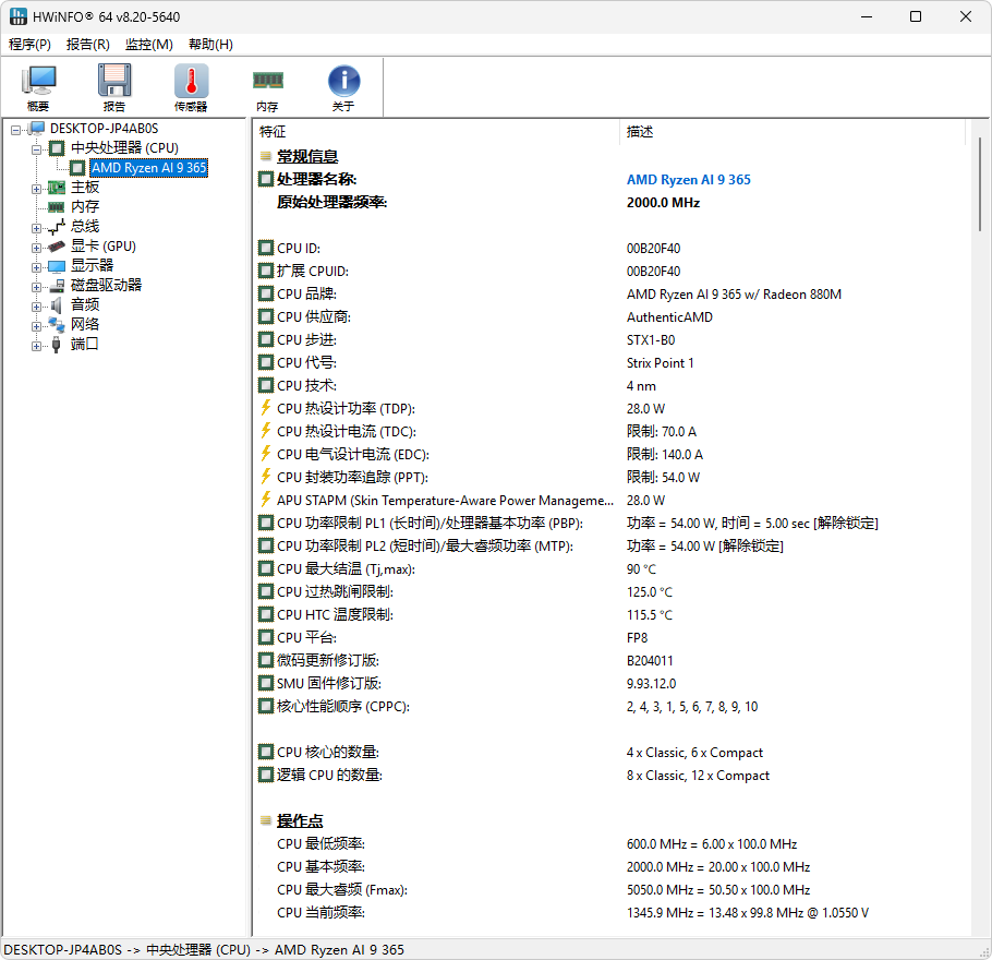 锐龙AI 9 365采用台积电4nm工艺,Zen5+Zen5c大小核架构,10核20线程(大核4C/8T+小核6C/12T),大核频率2.0~5.0GHz,小核频率2.0~3.3GHz,官方TDP功耗28W,零刻调校至54W。CPU-Z基准跑分,单线程789,多线程7791,整体性能相当于intel桌面处理器i7-12700。