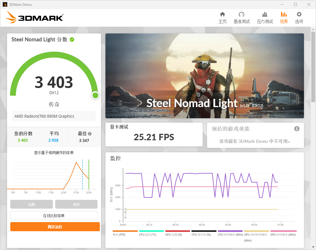 渲染分辨率2K的DirectX 12纯光栅基准测试,总分3403,平均帧率25fps。从同款GPU分布图可以看出,零刻SER9 Pro的性能释放优于Radeon 880M的标准水平。