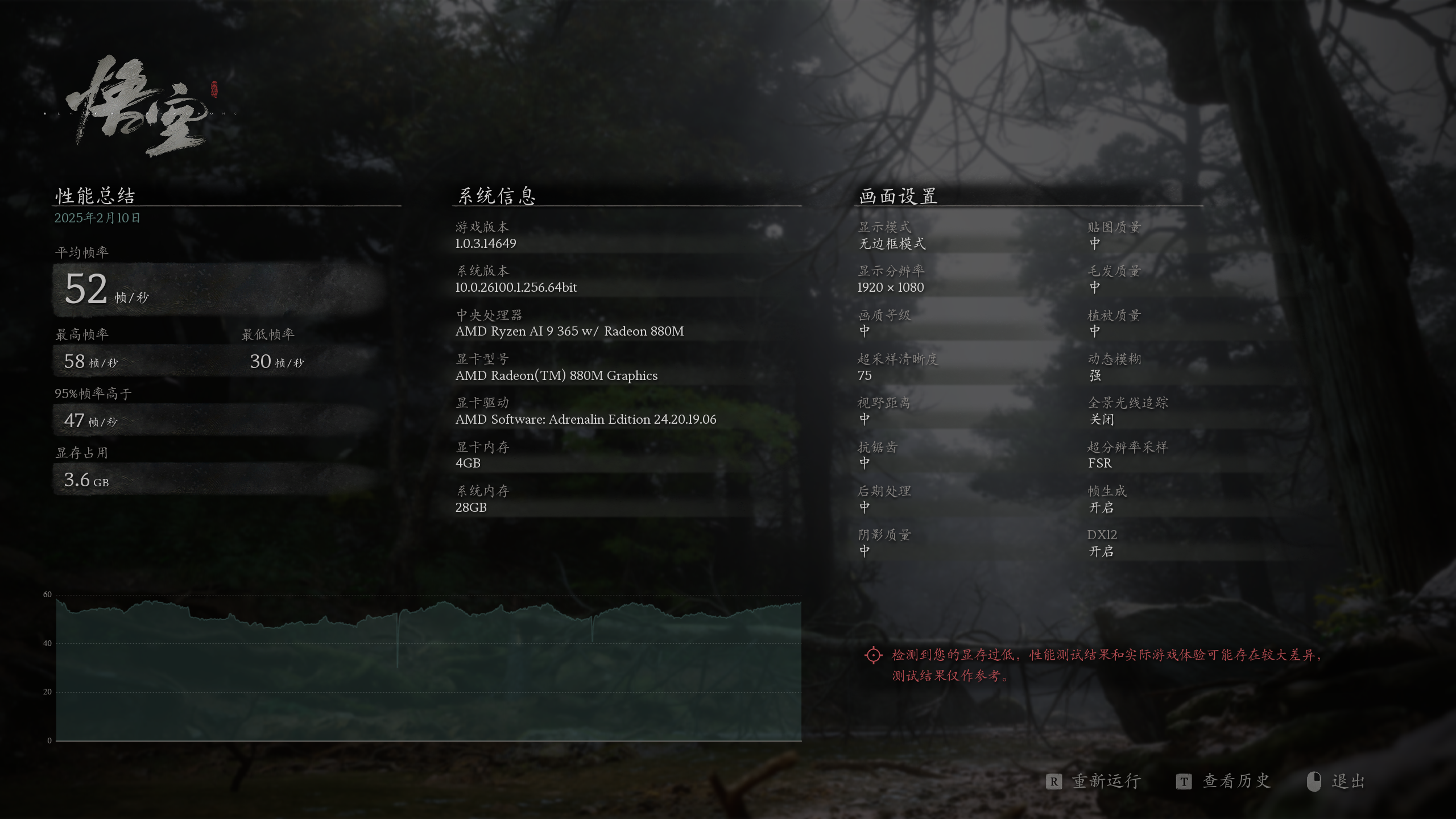 核显之光必须挑战的3A游戏标杆,需要说明的是,《黑神话:悟空》的帧率对画质设置非常敏感,修改任何一个设置项都可能让帧率过山车,因此这里尽量按默认设置做最小化调整,减少干扰因素,呈现SER9 Pro最原始的性能。