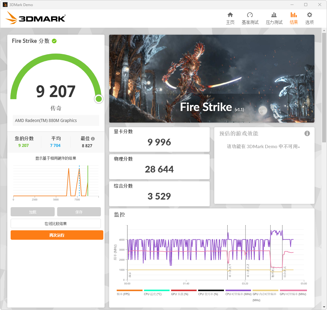 渲染分辨率1080p的DirectX 11基准测试,相对轻松愉快些,总分9207,显卡项目9996,物理项目28644,CPU&GPU综合项目3529。显卡项目相比锐龙8845HS提升24%。