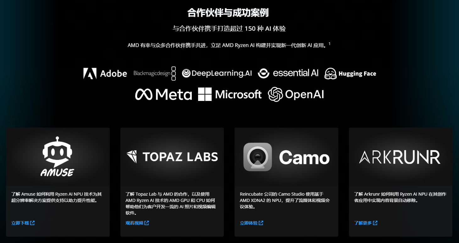 与时俱进的AI引擎,采用XDNA2架构,AI算力高达50 TOPS,相比上代锐龙8000系列的AI算力16 TOPS,可谓质的飞跃。值得一提的是,锐龙AI 300系列已通过Copilot+ PC的官方认证,与AI世代完美接轨。至于生态方面,AMD也在积极布局,与业界主流的AI应用进行广泛合作,充分发挥XDNA2架构的生产力。