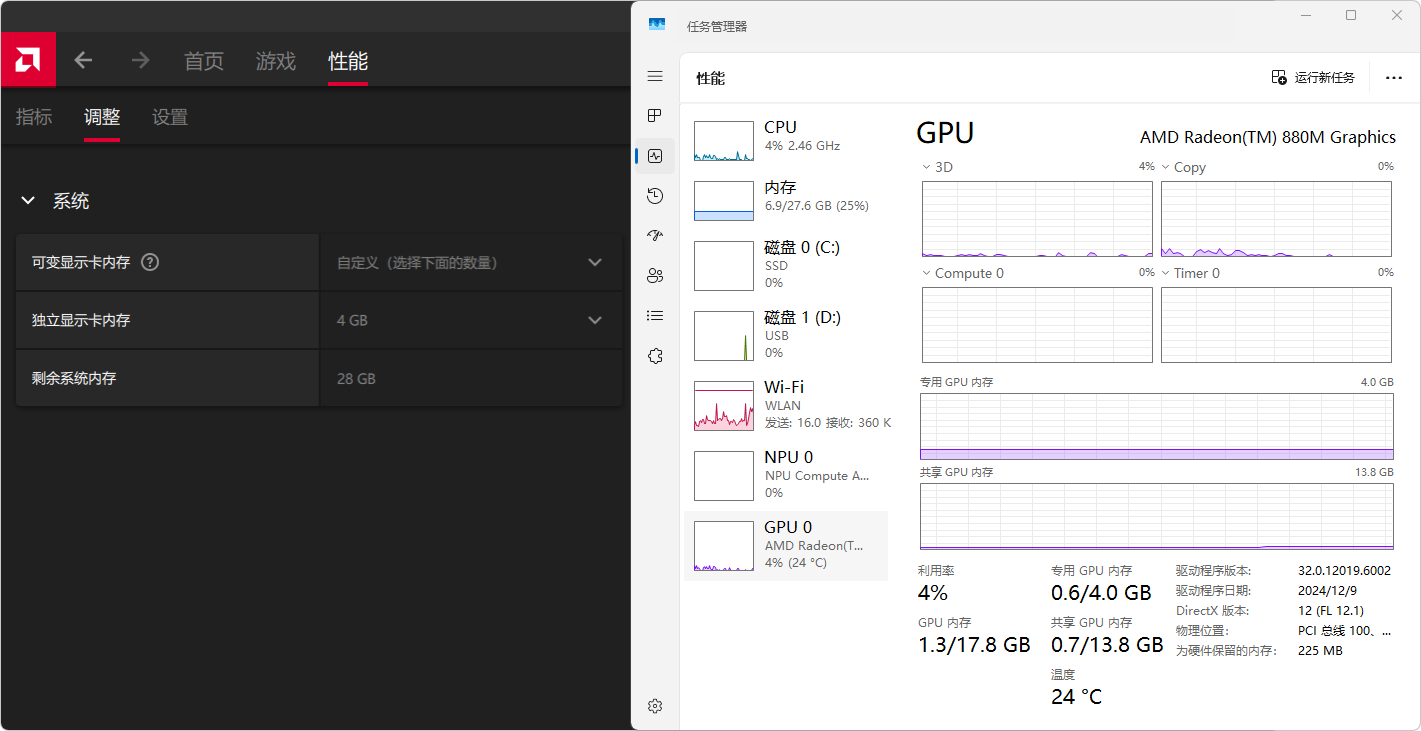 核显的显存照例从物理内存里固定预留+动态分配,默认预留4GB,相比SER8调个显存还要进BIOS,现在SER9 Pro倒是方便很多,直接在显卡驱动(AMD Software: Adrenalin Edition)就能调。