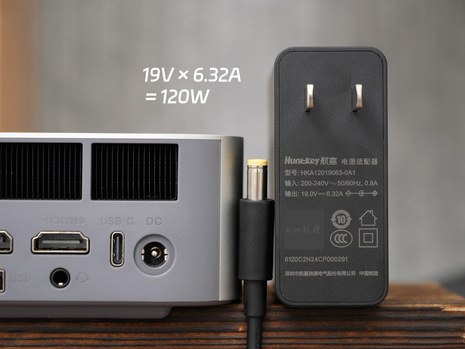 SER9 Pro标配电源型号为HKA12019063-0A1,功率120W(19V/6.32A),由航嘉代工,三围70×70×30mm,净重约260g,与主机身材同样mini,也是零刻最常用的电源适配器,支持最高65W的处理器调校功率绰绰有余。