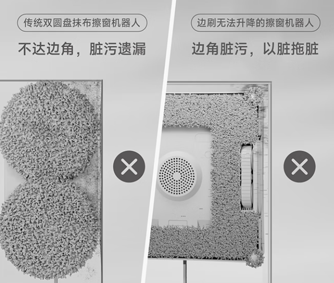 AI 自动导航:能扫玻璃大小、规划路线,覆盖 98% 以上面积,碰到窗框还会自动绕开,边角也能擦到。