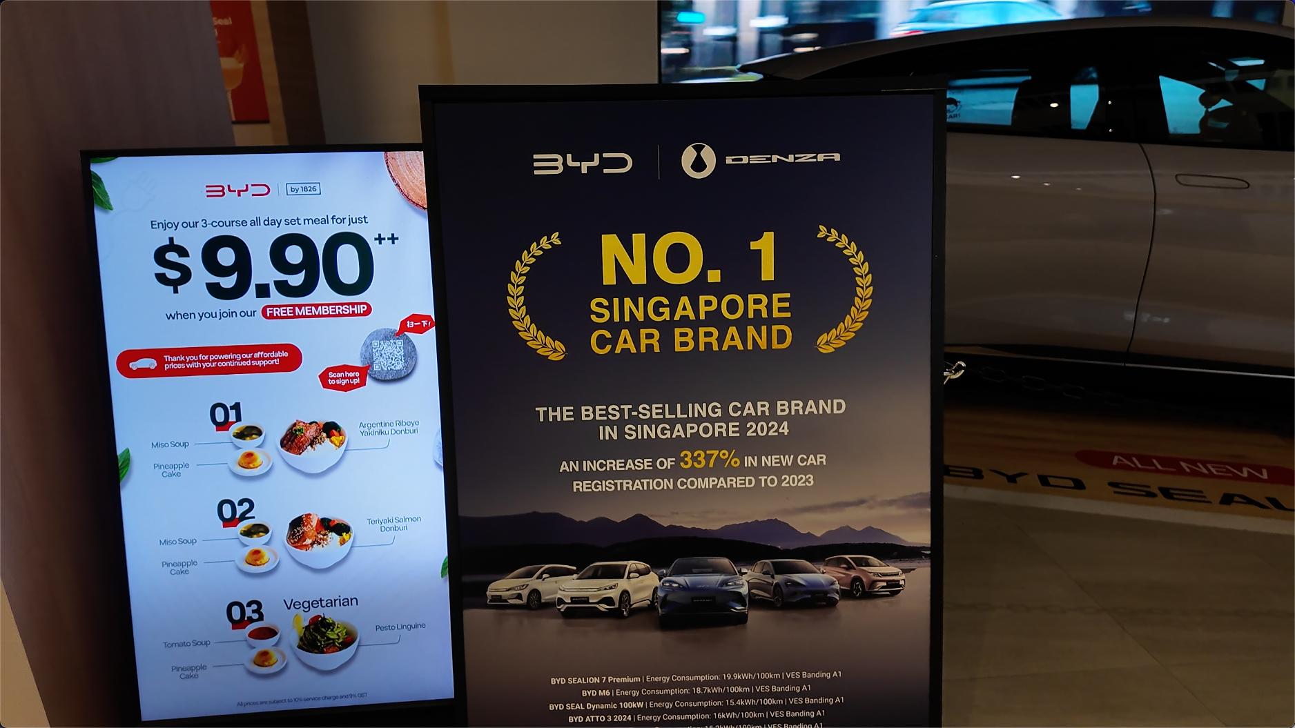 来时商场并未营业,待鸭子船游览完毕后刚好开门纳客。这家店尺寸不大,但可放置三台车,现场有ATTO 3一台,对应的是国内的元PLUS;比亚迪M6一台,对应的是国内的宋Max以及Sealion 7,对应的是国内的海狮07。这家店别出心裁的设计了与餐馆融合的新营销方式,看板上写了三道餐食9.9新币起。后来才知道这是1826餐厅老板与比亚迪做的联名,Boat Quay驳船码头店只是餐厅没有展车,新达城可以看车与试驾,正所谓男人试车,女人喝咖啡,一举两得的共赢营销,积累了不少人气。真心会玩!