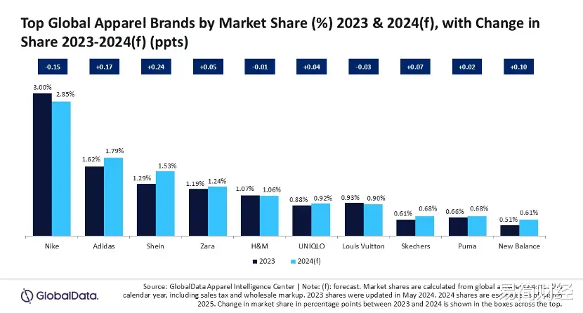 市场地位:2024年以1.53%份额跻身全球第三大时尚零售商,超越ZARA、H&M、优衣库,仅次于耐克、阿迪达斯(GlobalData数据)。